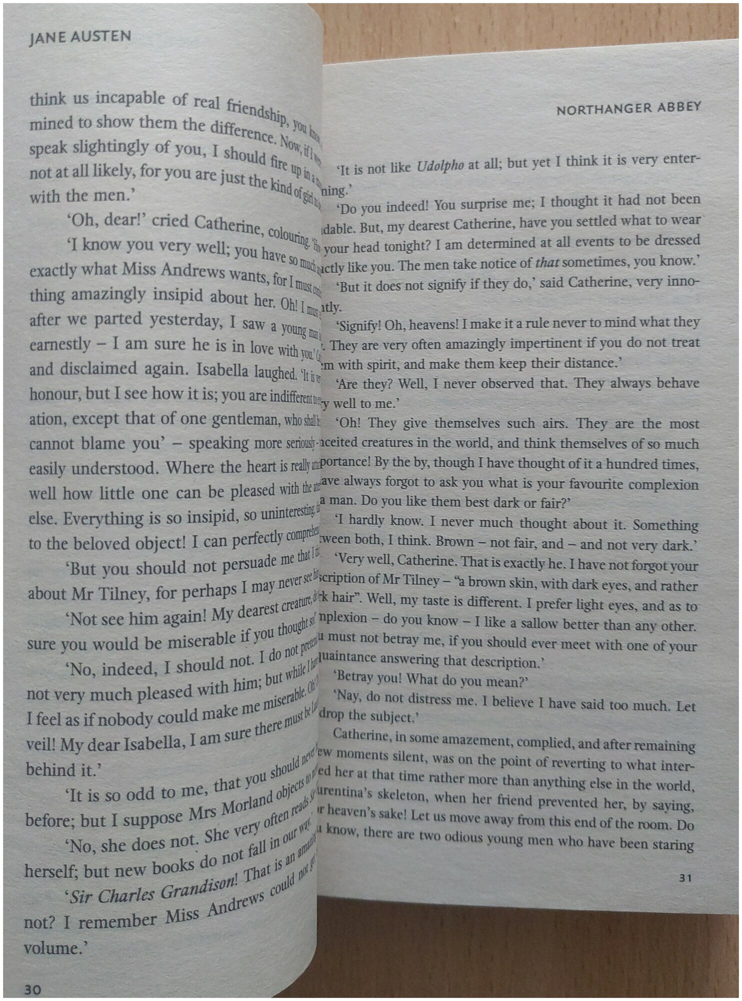 Я попросила подругу заказать мне эту книгу помимо еще парочки романов на английском языке. Приятно было носить компактное издание в сумочке и читать в кафе, погружаясь в ироничное повествование Остин, с нетерпением ожидая развязки. Чтение для любителей классического английского романа и желающих совершенствовать знание языка и британской культуры.