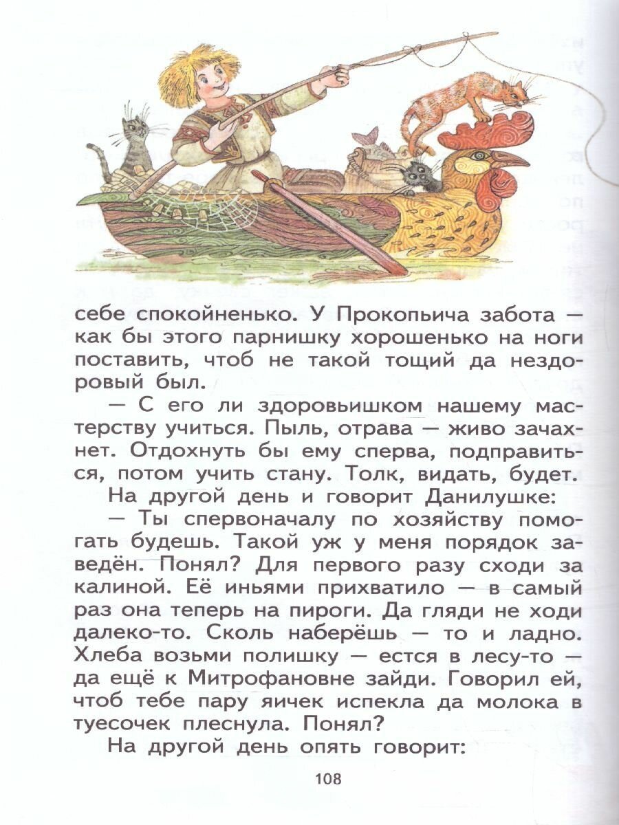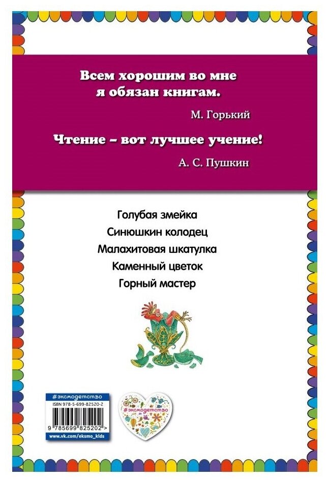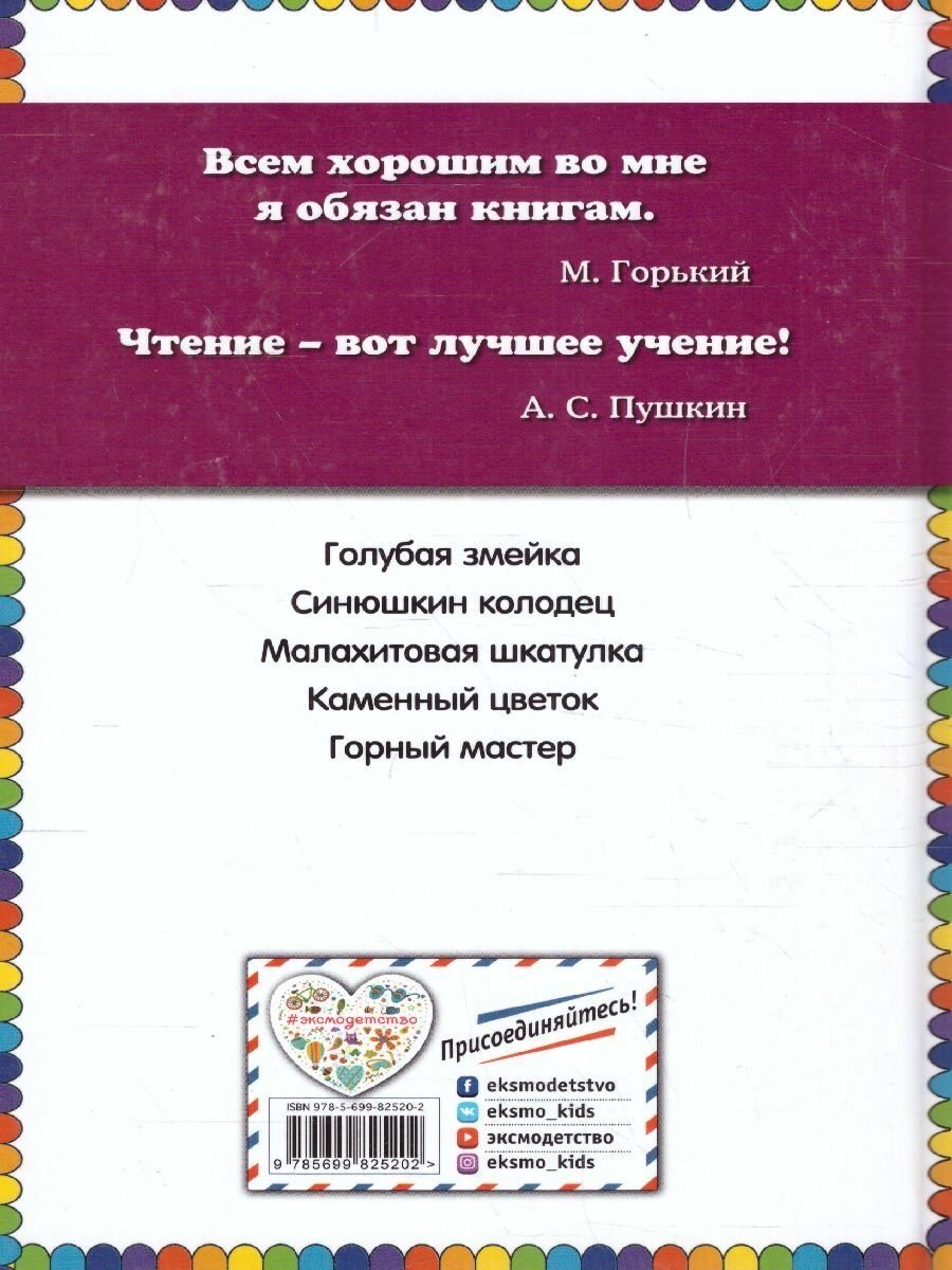 Мне очень нравятся книги этой серии, и эта - не исключение. В книгу вошли наиболее известные сказы Бажова: Голубая змейка, Синюшкин колодец, Малахитовая шкатулка, Каменный цветок, Горный мастер. Книга проиллюстрирована художником М. Митрофановым. Рисунков много, но есть они далеко не на каждой страницы. На мой взгляд, рисунки менее реалистичны, чем могли бы быть, хотя цветные, крупные. Книга выполнена в формате А5, имеет твердую глянцевую обложку, белые плотные странички, крупный шрифт. Книга рассчитана на младший и средний школьный возраст, но может быть прочитана и ранее родителями детям. В целом это хорошее издание за очень симпатичную цену.