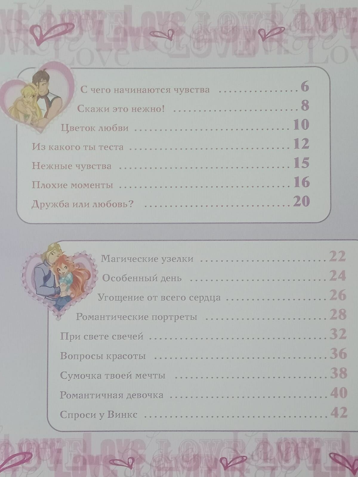 Книга в твердой обложке. Внутри на пружинке. Очень яркая, много картинок. На обложке "стразы" в виде сердечек. Книга о любви. Как себя вести в разных ситуациях. Ко многим советам, в конце страницы, в конвертиках лежат листочки для записок, что бы поделиться своими мыслями, Так же есть карточки, для гаданий. И небольшой объемный цветочек, для того же) В книге очень много советов по этикету, стилю. Много тестов и разнообразных поделок. Самого текста в книге немного, и он очень удачно разделен - детям удобно читать. Книга полностью оправдала мои ожидания и очень понравилась.