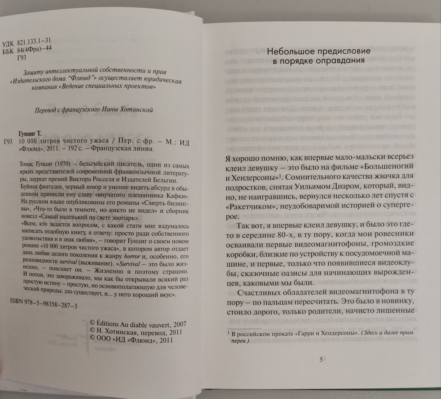 "Всем, кто задастся вопросом, с какой стати мне вздумалось написать подобную книгу, я отвечу: просто ради собственного удовольствия и в знак любви", - говорит Гунциг о своем новом романе "10 000 литров чистого ужаса", в котором автор отдает дань любви целого поколения к жанру horror и, особенно, его разновидности survival (выживание). "Survival - это было жизненно, - поясняет он. - Жизненно и поэтому страшно. И потом, это завораживало, мы как бы открывали всякий раз простую истину - простую, но основополагающую для человеческой природы: зло существует, и... у него хороший вкус".