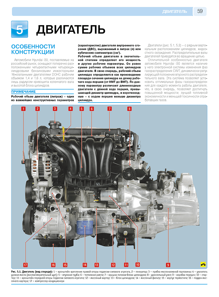 - Информация по ремонту таких составляющих автомобиля, как двигатель, ходовая часть Hyundai i30, трансмиссия, рулевое управление, тормозная система (каждый механизм в отдельной главе) - рассмотрены регулировки, малый и большой ремонт, сборка и разборка механизмов, узлов и агрегатов Hyundai i30