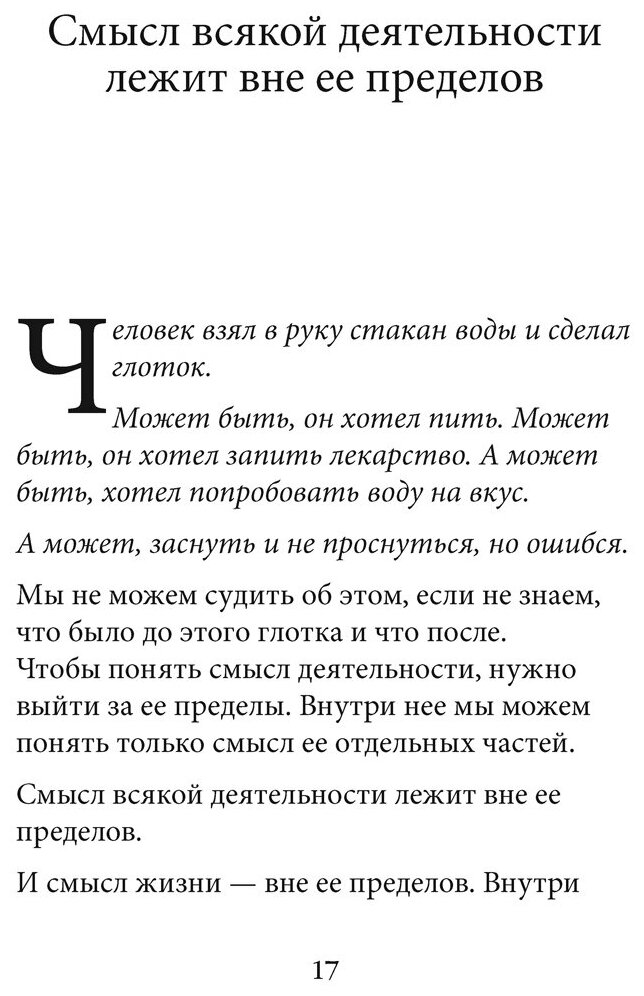 Книга понравилась очень. Не умею писать рецензий, но захотелось подарить её очень многим уважаемым мной друзьям. Кратко , афористично, образно она даёт верные ориентиры в жизни. Конечно, тому , кто их ищет. Почти после каждой главы хочется сказать:ну да! как же я раньше не видела!