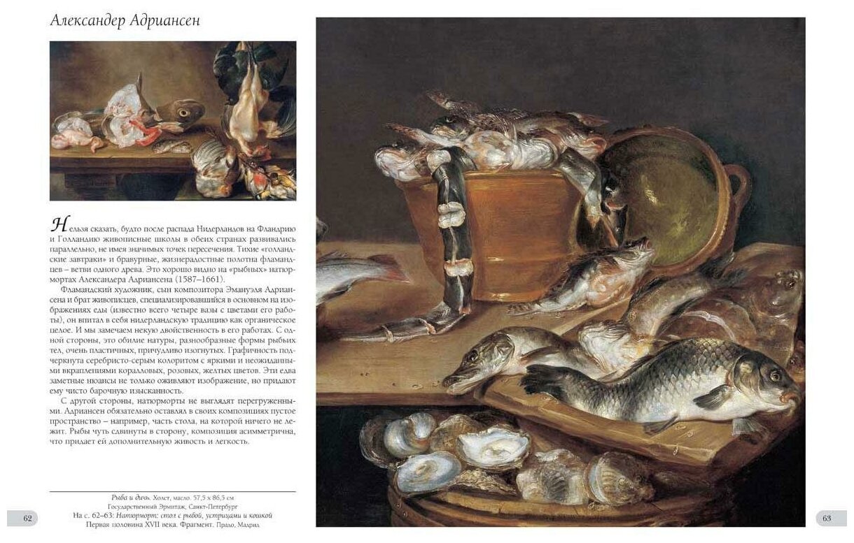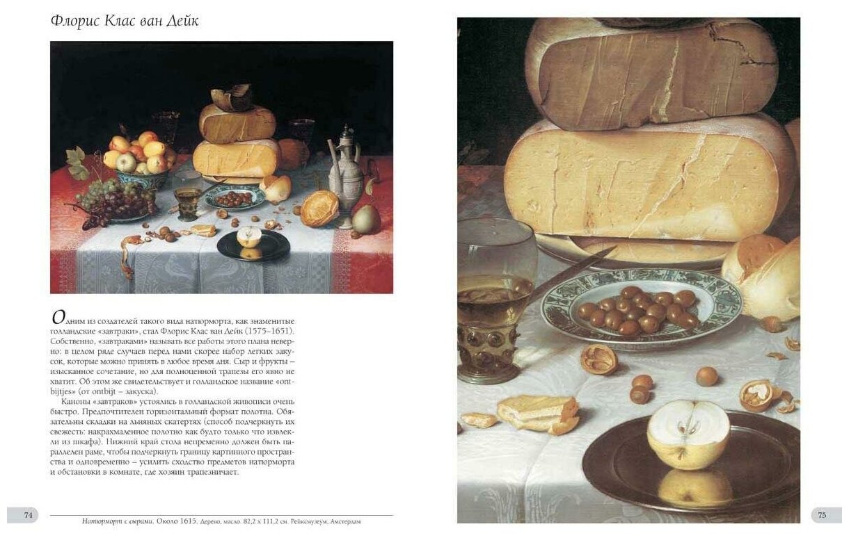 Можно говорить о нескольких устойчивых типах натюрморта. Первый, разумеется, - цветы и фрукты. Второй - разного рода лавки или рынки (так они назывались во фламандской традиции; в испанской утвердилось название "бодегон" от слова "харчевня, трактир"). Третий - натюрморты с дичью, охотничьи, очень близкие к мясным лавкам. Четвертый - так называемые "завтраки" (они были распространены в Голландии). Пятый - музыкальные инструменты. Этот тип во многом схож с шестым, получившим название "vanitas" (от слов Екклесиаста: "Vanitas vanitatum et omnia vanitas", или "Суета сует и все - суета"). Это композиции, посвященные теме бренности человеческого существования и тщеты земных амбиций. К "vanitas" примыкает также так называемый "ученый натюрморт" (композиции с изображением черепа в Голландии назывались "doodshoofd"), а к нему, в свою очередь, пронк-натюрморт (от голландского pronken - "показывать", "выставлять", "проявлять"). Пронк-натюрморты служили для того, чтобы показать обстановку жизни коллекционера, ученого, художника. Девятый тип - обманки, или тромплеи (от французского trompe-l'oeil - "оптическая иллюзия), на которых предметы написаны так, что выглядят настоящими (в Голландии эта разновидность натюрморта носила название "bedriegerje"). Особенностью данной книги является стремление составителей охватить все существующие виды натюрморта и дать емкую характеристику каждого из них. Книга может стать подспорьем преподавателям творческих вузов, студентам поможет написать реферат, а любители живописи смогут и сами наслаждаться произведениями искусства, а также подарить такую возможность своим друзьям.