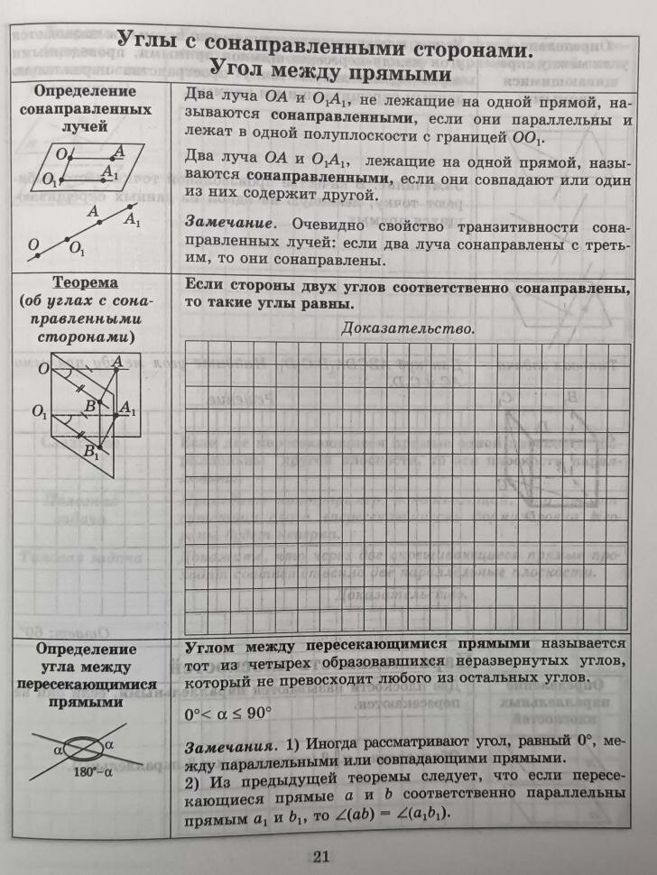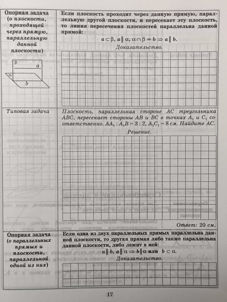 Книга для родителей и вдумчивых , целеустремленных десятиклассников. По структуре строго следует за учебником. Основной конспект изложения табличной форме , там же представлены базовые задачи и методы из решения. Далее есть возможность прорешать несколько базовых задач . Если учитель требует учить доказательства теорем , в тетради есть возможность отработать краткую запись доказательств. Рекомендую всем, кто серьезно относится к геометрии