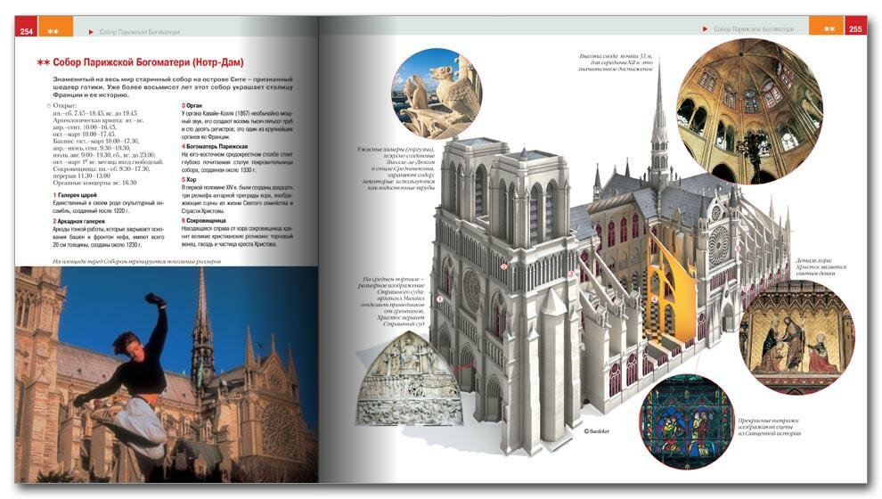 Истинный турист не отправляется в свой путь без путеводителя: ведь очевидно, что за то короткое время, которое отводится на отпуск, без грамотно продуманного маршрута, не получится увидеть практически ничего. =) Зарубежные издания путеводителей Бедекера мне давно нахваливали некоторые друзья. Более того, я даже слышала, что «бедекер» это чуть ли не синоним вообще путеводителя по имени их создателя! И вот наконец-то их издали на русском языке. Да ещё и в прекрасном качестве. Этот путеводитель по Парижу превзошёл все мои ожидания! Во-первых, о самом издании: книга в плотной обложке с пластиковым чехлом, страницы мелованные, формат небольшой, шрифт дольно мелко, но вполне читабельный, книжка толстенькая. Количество иллюстраций зашкаливает! =) Путеводитель составлен так, что можно узнать по чуть-чуть обо всём, что нужно: какие достопримечательности посмотреть, в каком отеле остановиться, как спросить по-французски, как пройти куда-нибудь (есть небольшой разговорник). Если 3D иллюстрации знаменитых мест, Нотр-Дама, например. В каждом разделе, помимо основной, есть полезная справочная информации: по истории Парижа или конкретно того места, о котором говорится. Есть, правда, и отдельный раздел конкретно по истории Парижа – очень интересный. Можно составить свой маршрут, опираясь на информацию из путеводителя, а можно воспользоваться одним из 5 предложенных. К путеводителю даже прилагается отдельная карта для автомобилистов. В итоге, это подробнейший и очень увлекательный путеводитель, который приятно читать не только собираясь в путешествие во Францию, а даже просто тем, кто любит Париж: после прочтения уже создаются впечатление, что побывал в этом городе. =))