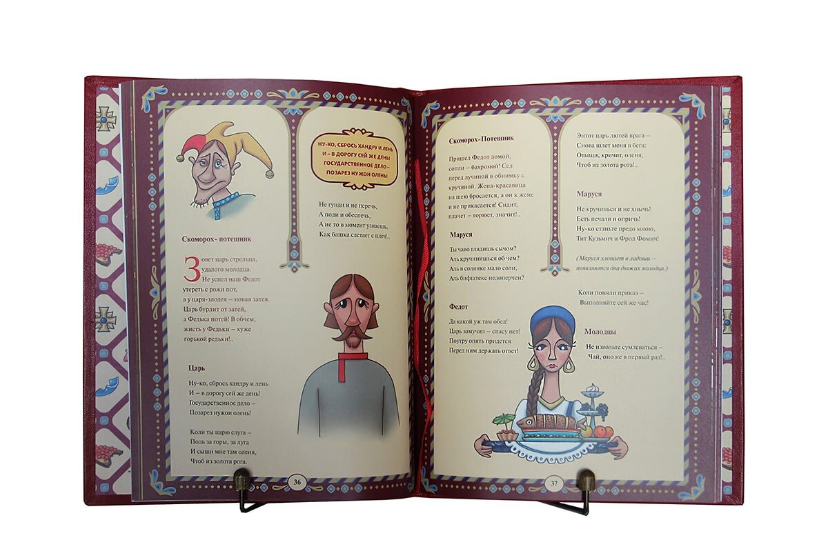 достойное издание для известного произведения Л.Филатова.Во-первых порадовало качество полиграфии: мелованная бумага, твердый переплет. Во-вторых оформление:каждая страница оформлена изображением резных потолков древнерусских палат. продуман облик каждого персонажа, очень грамотно прорисована вся мимика. Получились своеобразные портреты-медальоны, которые встречаются не раз на страницах книги, подсказывая своим видом нужную интонацию для чтения строк. Есть отдельные страницы без текста, как правило, целый разворот, на котором дается полноценная сюжетная иллюстрация: изображение ковра, прогулка генерала к Бабе-Яге, Федот на острове Буяне и т.д.Такие фрагменты создают ощущение мультипликации, что очень удобно для чтения книги детьми или детям. в тексте отдельными островками дублируются крылатые фразы, вышедшие из этого произведения. В конце книги все цитаты и афоризмы представлены отдельным списком.