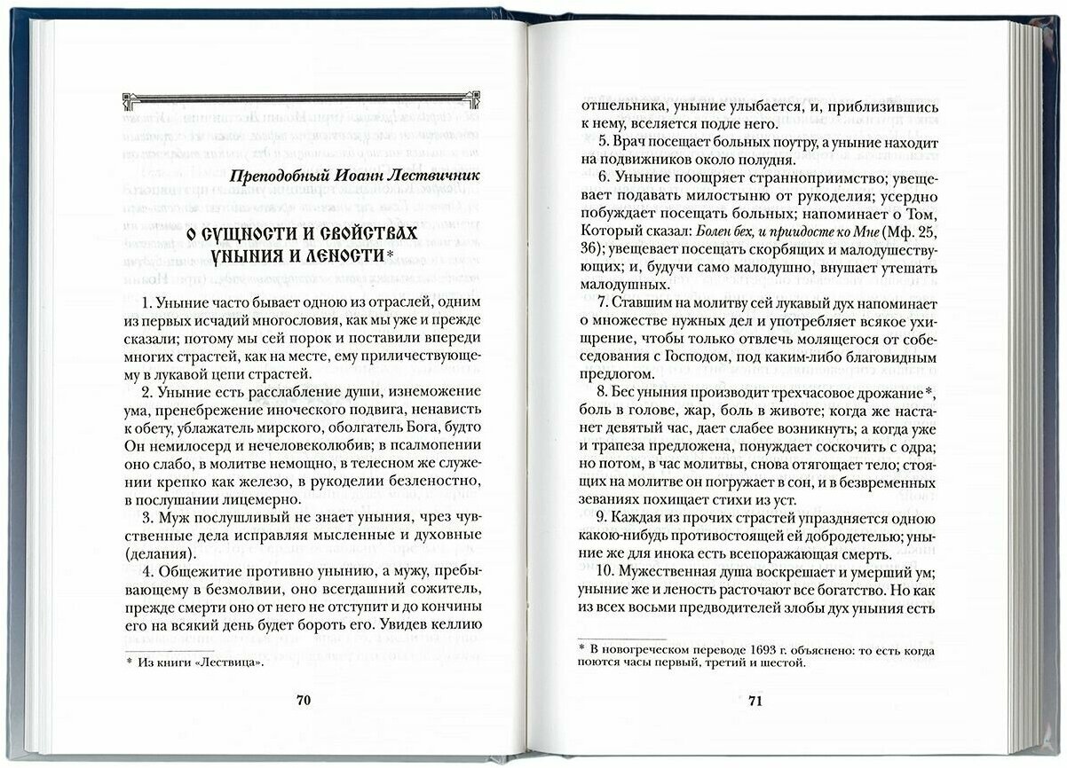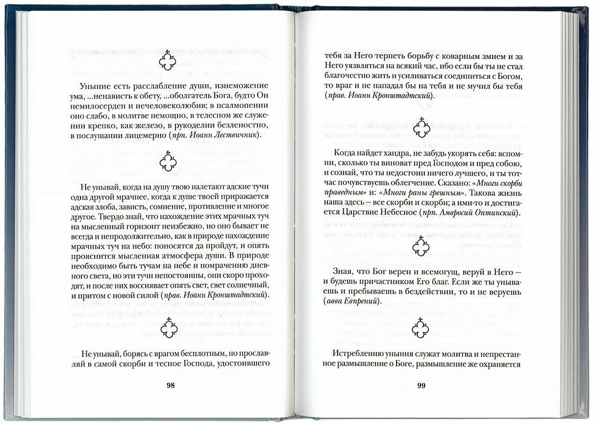 В книге довольно всесторонне и подробно отражены многие грани уныния Отцами прошлых веков и современности. И не только об унынии говорит нам опыт Великих христиан, они затрагивают широкий спектр тех чувств и пороков, которые вращаются в поле притяжения этого греха, например, схожий и близкий грех - печаль. С разных сторон Святыми Отцами Церкви рассматривается ход течения, а также последствия уныния. Несомненно здесь обязательно найдутся ответы на очень многие вопросы. Для меня чтение оказалось полезным.