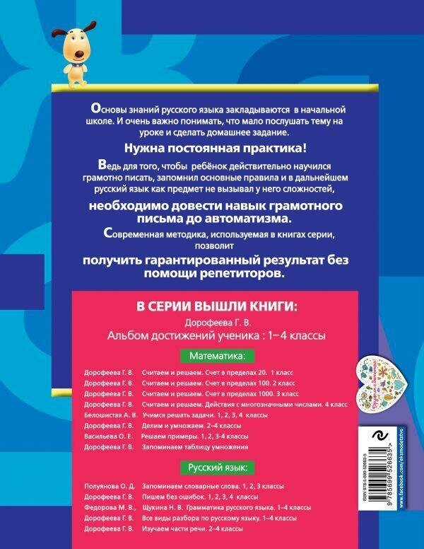 Для того чтобы писать грамотно необходимо очень много тренироваться, особенно в начальной школе. Навыки грамотного письма необходимо довести до автоматизма. Предлагаемое пособие предназначено для учащихся начальной школы и рассчитано на все 4 года обучения. Задания соответствуют новым образовательным стандартам и разделены по классам. Занимаясь по этой книге, школьники смогут повторить все основные темы по русскому языку за курс начальной школы и развить и закрепить навыки безошибочного письма.