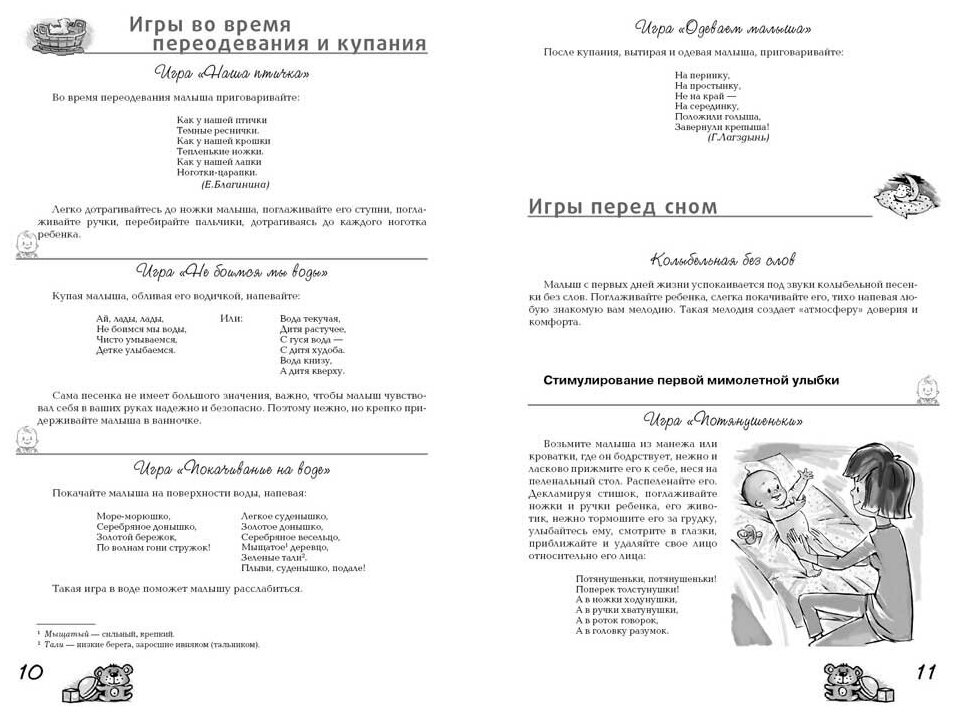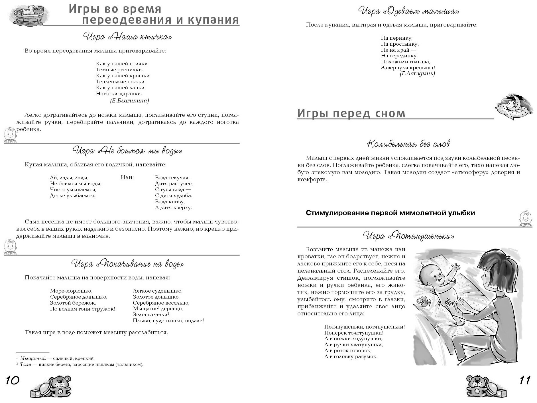 Пособие посвящено особенностям воспитания и обучения ребенка в первый год жизни. Приводятся различные игры-забавы, упражнения, потешки и т.д., способствующие эмоциональному взаимодействию ребенка со взрослым, развитию зрительного и слухового восприятия, звуковой активности и предпосылок для понимания речи, двигательной активности, мелкой моторики руки, первых предметных действий. Предлагаются музыкальные игры с учетом особенностей развития ребенка этого возраста.