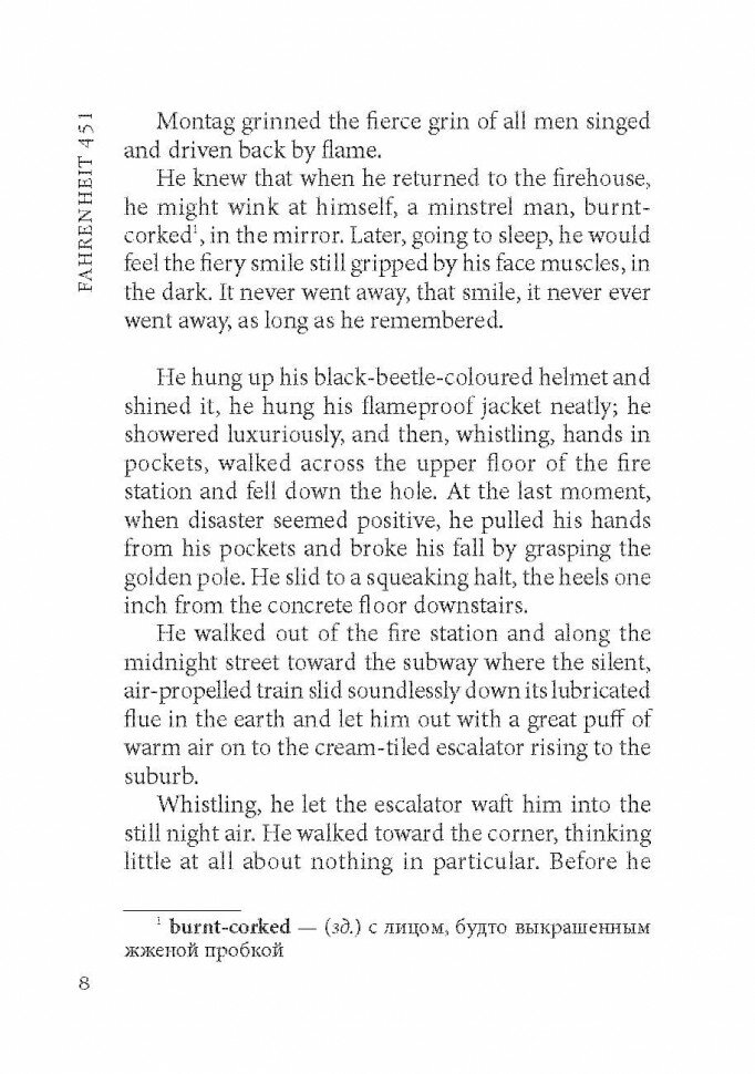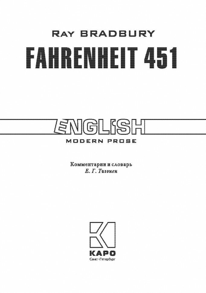 Повесть знаменитого американского писателя-фантаста «451 градус по Фаренгейту» написана более полувека назад, но своей актуальности не потеряла и по сей день. Ее лейтмотив - озабоченность духовным обликом будущего. Будущее, как его видел Бредбери, довольно мрачно: тоталитарное государство, в котором пресекается любое инакомыслие. Реклама, бесконечные телешоу - вот и все, что нужно человеку для безмятежного счастья. Так решило государство, и оно защищает своих граждан в меру собственного разумения: разговаривать друг с другом - значит думать, думать заставляют книги, поэтому, дабы не нарушать покоя обывателей, их надлежит сжигать. 451 градус по Фаренгейту - это температура горения бумаги. Предлагаем вниманию читателей неадаптированный текст повести, снабженный комментариями и словарем.