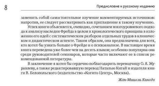 Жан-Мишель Кинодо проделал огромную работу, сведя в одну книгу материалы семинаров по изучению трудов Фрейда и создав фундаментальный путеводитель по огромному наследию основателя психоанализа. Биографические справки о соратниках, оппонентах и пациентах З.Фрейда сами по себе – захватывающее чтение. Замечательная книга, помогающая проникнуться духом эпохи и глубже понять тексты основателя психоанализа, а также проследить развитие его идей.