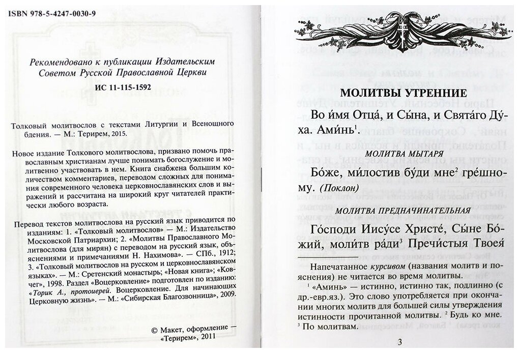 Прекрасное издание для думающего христианина. Содержит все необходимые домашние молитвословия: утреннее и вечернее правило, часы Пасхи, ко Причастию и благодарственные, каноны совмещенные, и молитвы в течении дня: перед едой, учением, принятием просфоры. Плюс подробный текст песнопений Литргии и всенощной. Везде по тексту идут комментарии, пояснение, ссылки и перевод трудных слов.