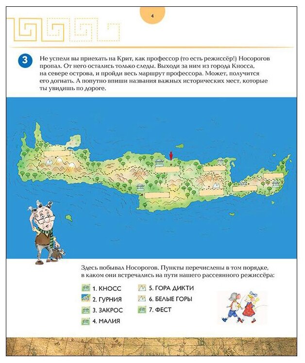 Сделай сам: критская фреска. «Кинопутешествие на остров лабиринтов» — сборник оригинальных задач по истории Древнего Крита. В основе книги — сюжет об археологе Носорогове, который решил стать режиссёром и снять фильм о Минотавре. Ребёнок узнает, как строились минойские дворцы-лабиринты, что такое «лабрис» и какие костюмы носили древние жители острова. Мифологические сюжеты о Дедале и Икаре, похищении Европы и поединке Геракла с критским быком, о которых ребёнок прочтёт в книге, помогут понять, как минойцы видели мир три с половиной тысячи лет назад. В «Кинопутешествии на остров лабиринтов» собраны упражнения на развитие воображения, пространственного мышления, памяти, внимания, навыков счёта. Интерактивный компонент позволяет ребенку обучаться играя. История оживёт, станет понятной и близкой.
