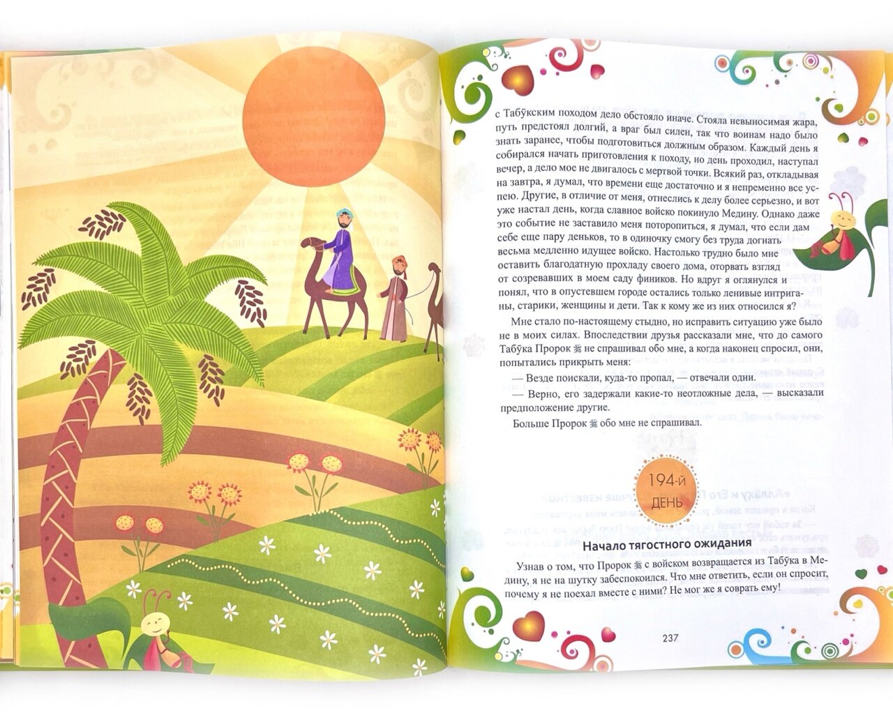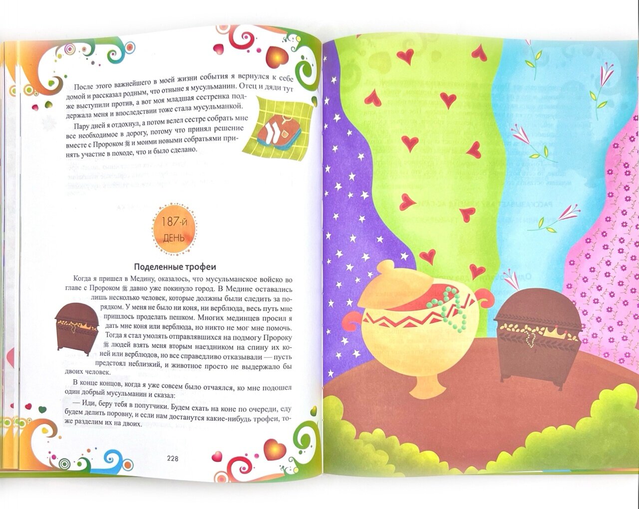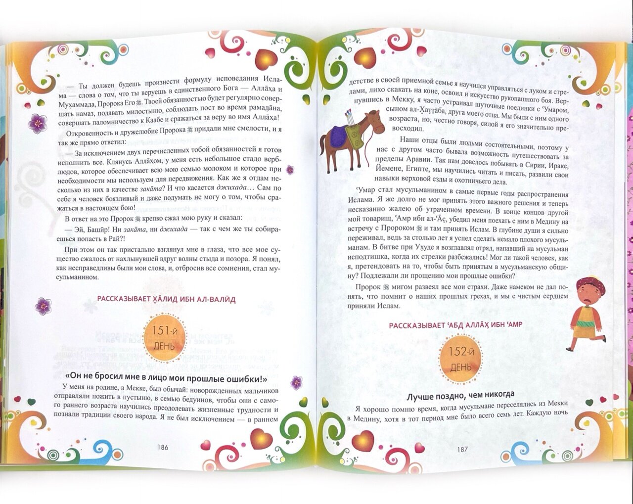 Книга очень классная. Формат А4, твердый переплет, около 450 страниц. Хорошо иллюстрирована. На каждой странице красивые яркие картинки. Сама книга состоит из 365 рассказов. Повествование каждого рассказа ведется от сподвижников Пророка Мухаммада (с.а.в.с), что придает сюжету необычайную оригинальность. Написана на доступном детскому восприятию языке. Я бы рекомендовала для детей в возрасте 7+.