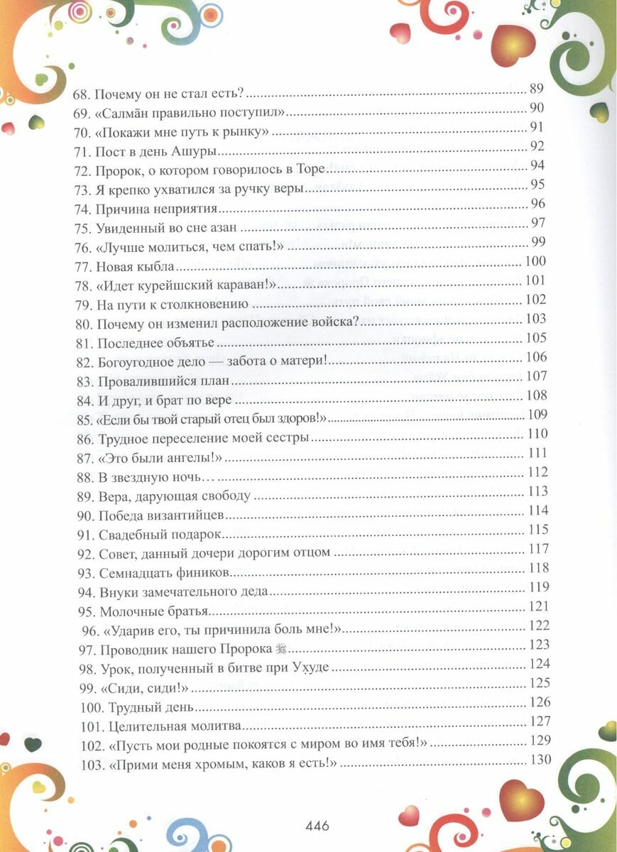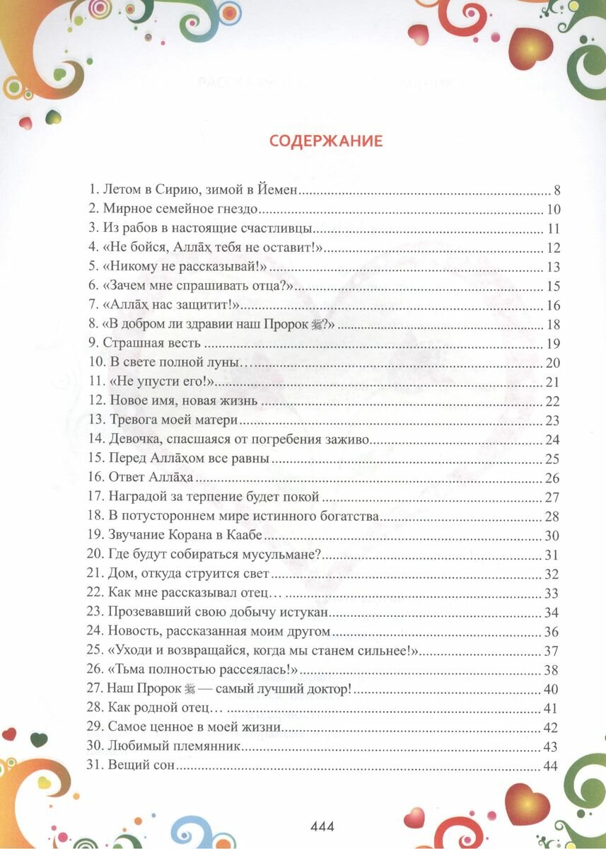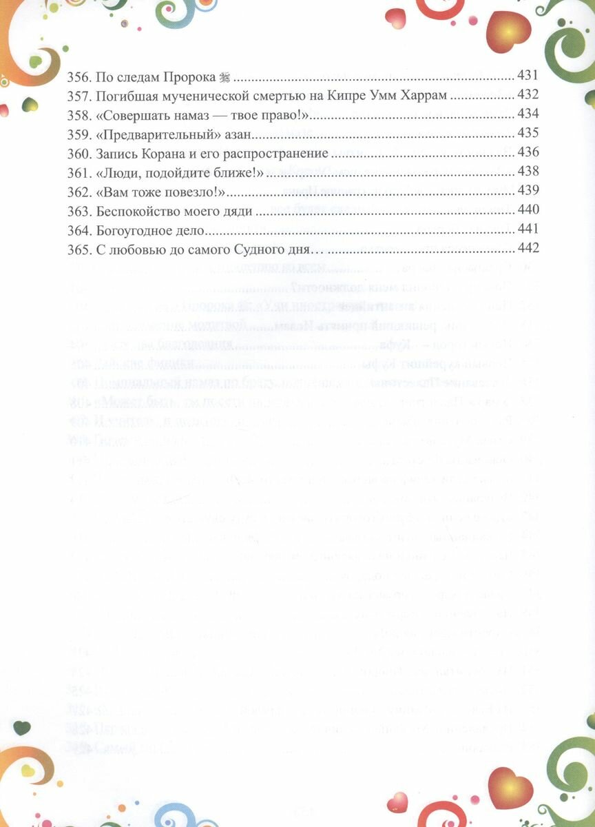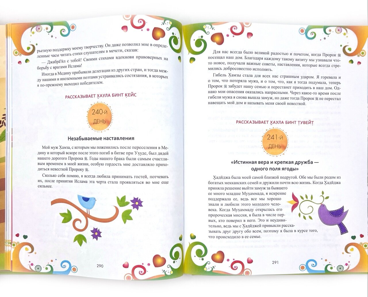 Книга очень классная. Формат А4, твердый переплет, около 450 страниц. Хорошо иллюстрирована. На каждой странице красивые яркие картинки. Сама книга состоит из 365 рассказов. Повествование каждого рассказа ведется от сподвижников Пророка Мухаммада (с.а.в.с), что придает сюжету необычайную оригинальность. Написана на доступном детскому восприятию языке. Я бы рекомендовала для детей в возрасте 7+.