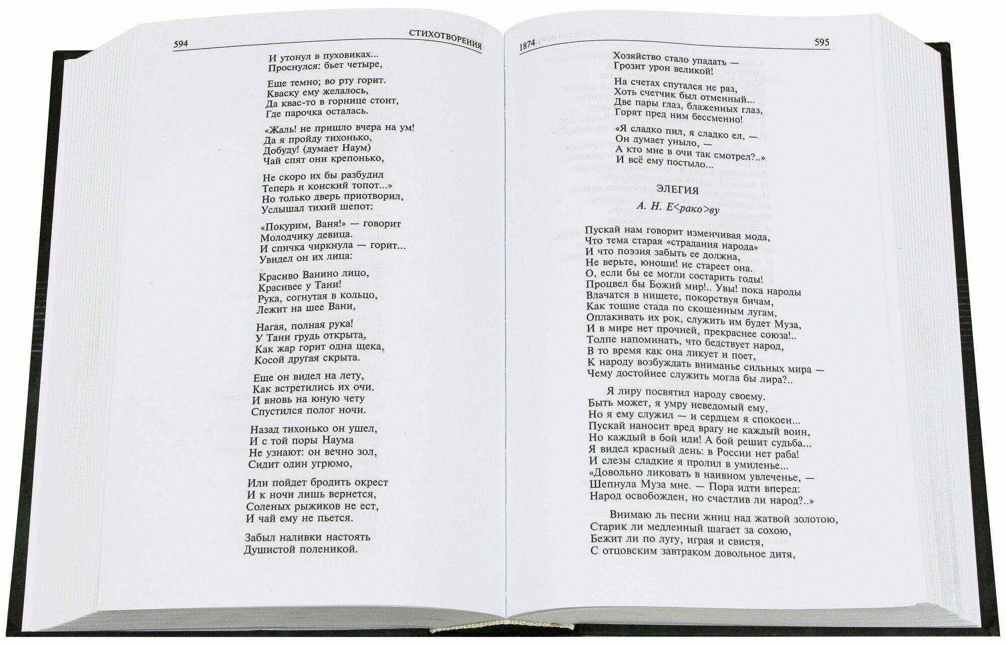 В целом книга хорошая. Текст читается легко, не мелкий. Бумага белая, немного просвечивает, но это не мешает. Год произведения стоит наверху страницы - т.е. все произведения разбиты по годам - начиная с дебюта 1838г по 1877г. Далее поэмы идут уже не по годам, а по названиям. Года проставлены не везде, т.е. год написания некоторых произведений надо искать в других источниках.