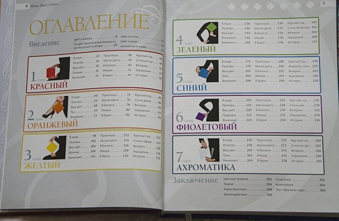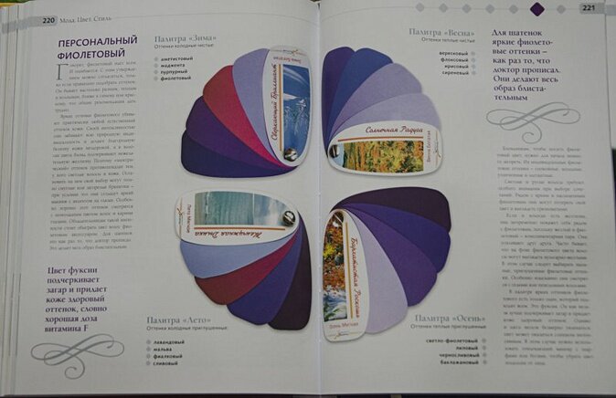 В издании рассматриваются 8 основных цветов, их подтонов и оттенков, и для каждого из типов: весна, лето, осень, зима