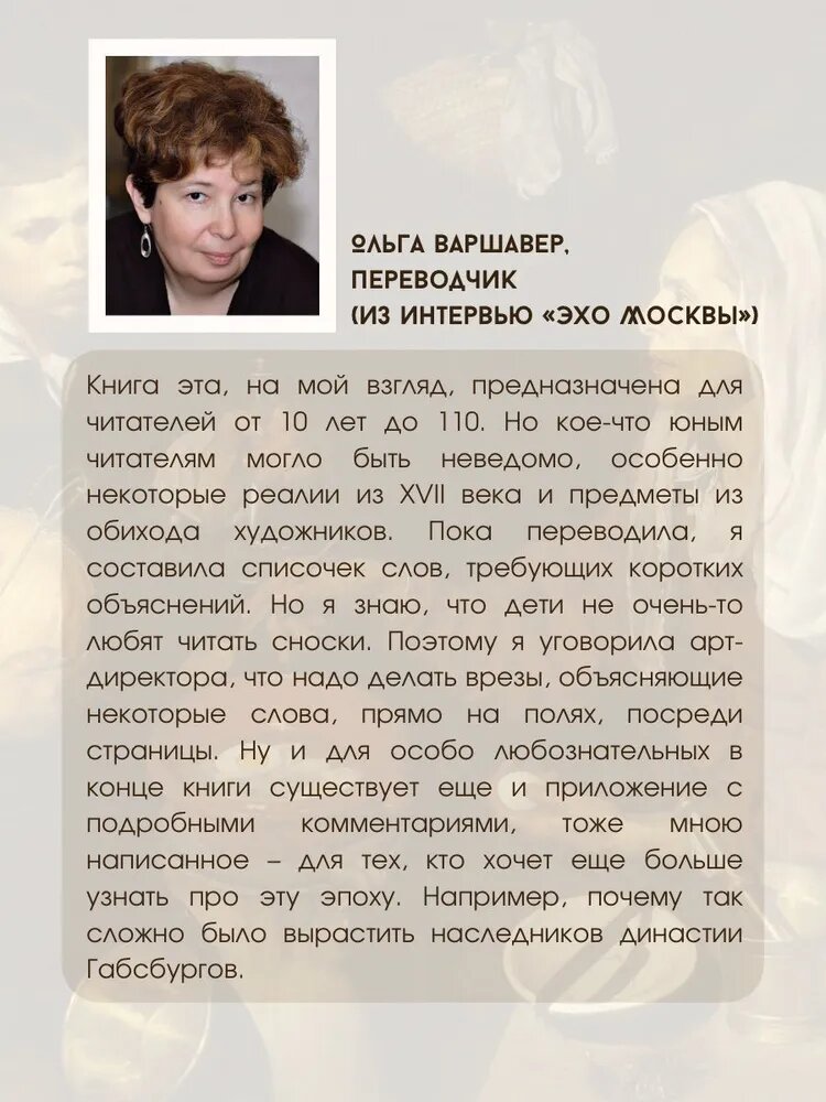 Отличная книга, прочитали с ребенком 9 лет, написана очень хорошим языком, иллюстрациями служат репродукции картин Веласкеса, много интересных фактов из жизни Веласкеса, и всего испанского двора, того времени. Очень советую, особенно детям, интересующимся живописью. Ольга