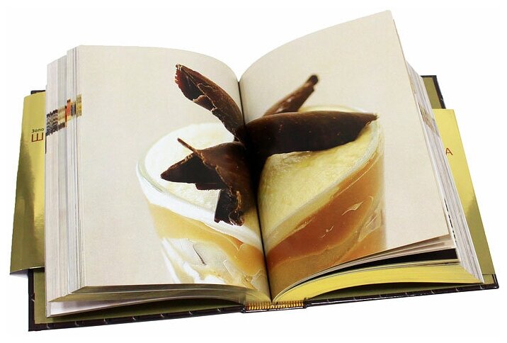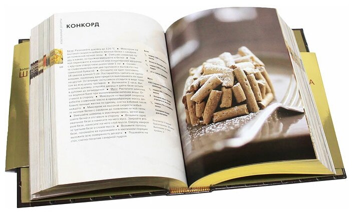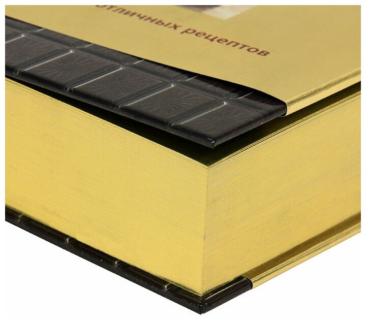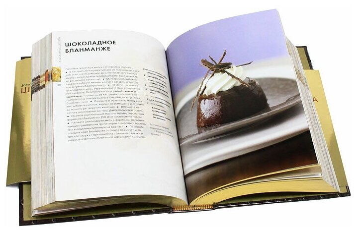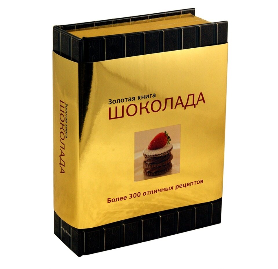 "Золотая книга шоколада" - великолепный подарок! Прекрасное оформление - 700 страниц, мелованная бумага, фотографии просто высокого художественного уровня, золотой срез! Обложка чуть выпуклыми плиточками имитирует шоколад. И содержание не уступает оформлению - немного истории вначале и рецепты на любой вкус - печенье, кексы, кремы и пудинги, даже острая экзотика - оленина под шоколадным соусом!