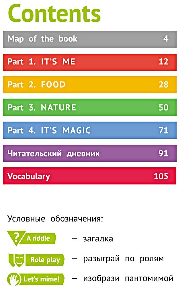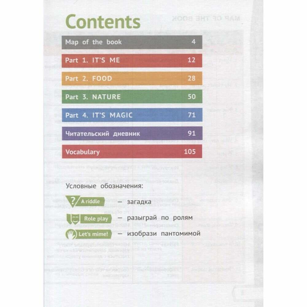 Отличное дополнительное пособие по языку! Очень напомнило иностранные издания так как здесь представлено большое разнообразие материала и даже есть поделки! Стишки, рифмовки, рассказы, сказки, считалки, легенды и т.д., кроссворды, тесты и многое другое. Яркие иллюстрации интересные герои. Темы: It's me, food, nature, it's magic. В конце есть читательский дневник, в который можно записывать, что прочел и короткое мнение о этом. Фразы, с помощью которых можно написать свое мнение, даны там же. В конце есть обширный словарик. Так же есть еще краткий справочник по жанрам литературы, в котором очень просто объяснены их особенности. Автор указывает, что книга подходит ученикам 3-го класса, но я бы рекомендовала ее использовать ближе к четвертому, так как и лексика местами сложноватая, и конструкции грамматические не для 3-го класса, да еще и достаточно много Past Simple, а его проходят в 4 классе (хотя и по некоторым программам и в 3-м).