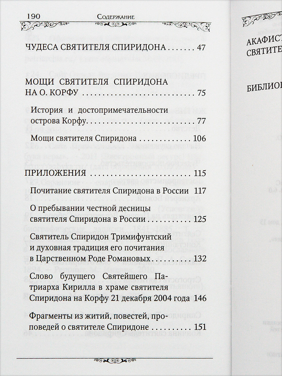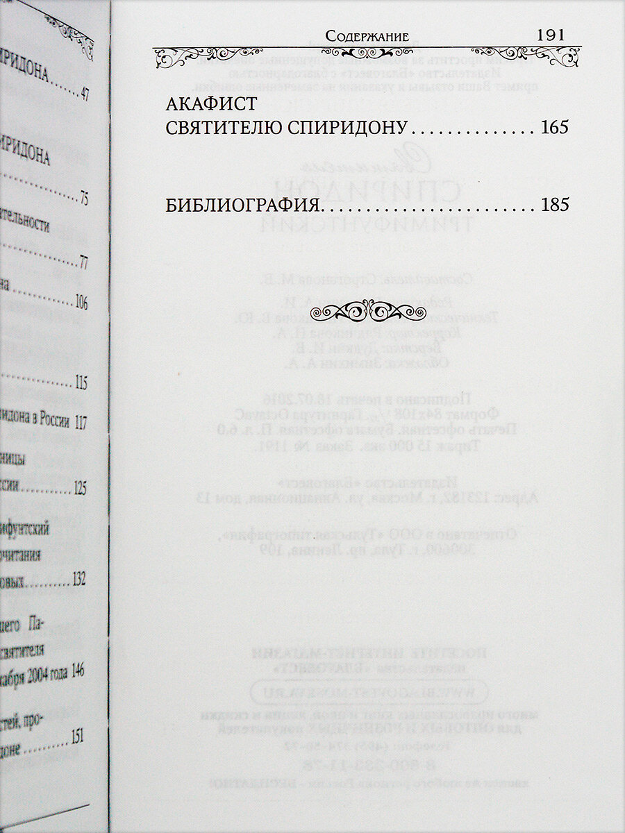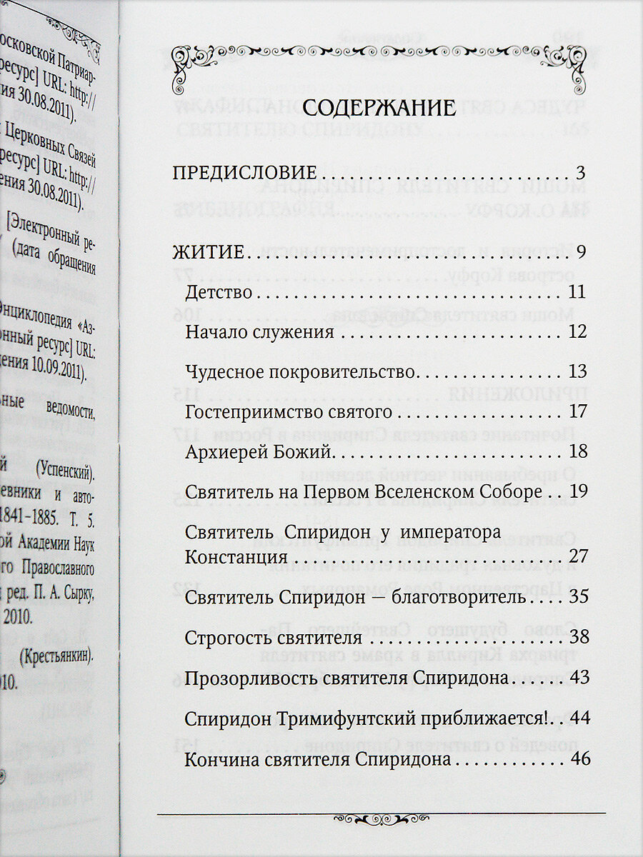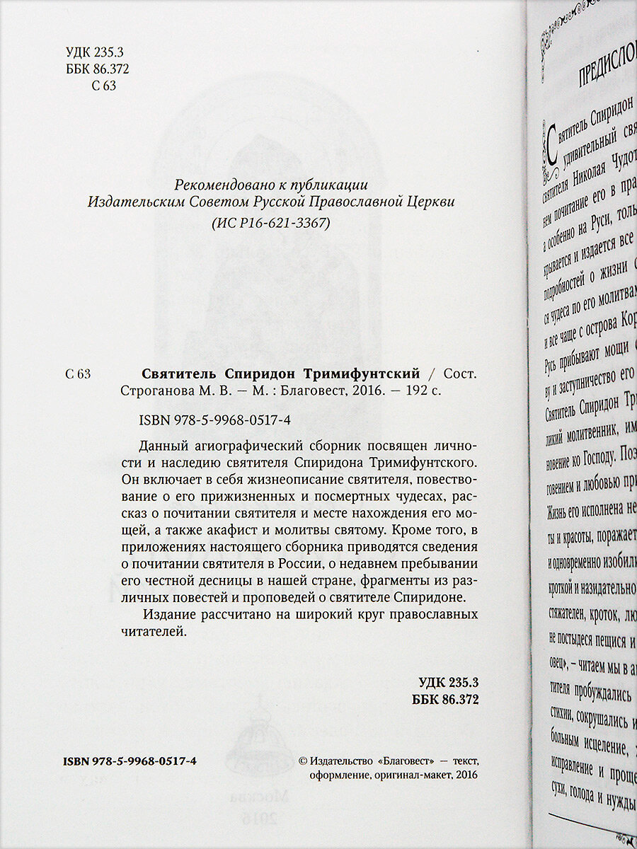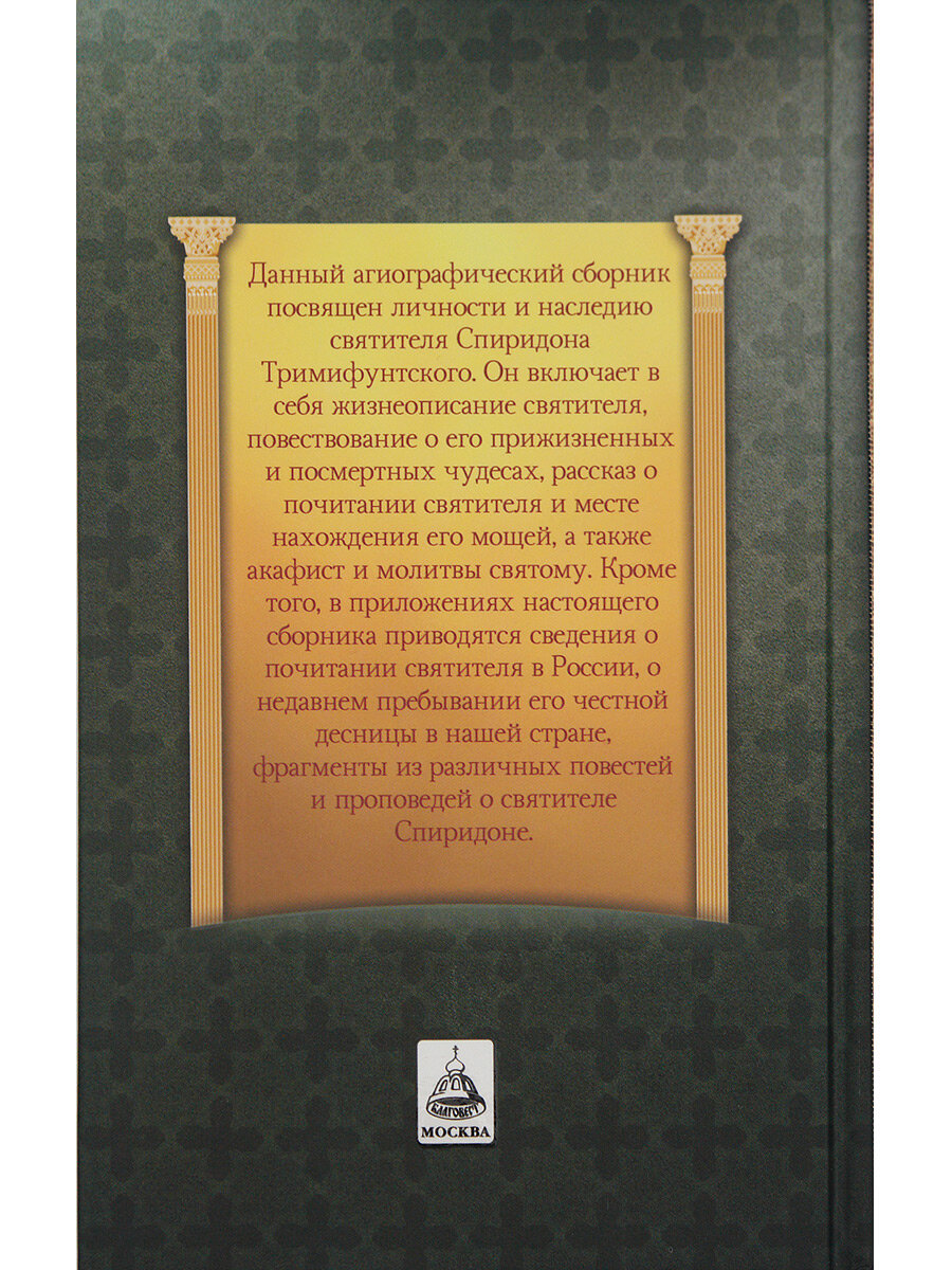 Данный агиографический сборник посвящен личности и наследию святителя Спиридона Тримифунтского. Он включает в себя жизнеописание святителя, повествование о его прижизненных и посмертных чудесах, рассказ о почитании святителя и месте нахождения его мощей, а также акафист и молитвы святому. Кроме того, в приложениях настоящего сборника приводятся сведения о почитании святителя в России, о недавнем пребывании его честной десницы в нашей стране, фрагменты из различных повестей и проповедей о святителе Спиридоне.