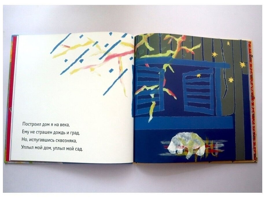Двусторонняя: с одной стороны стихотворение про иголку и нитку, с другой - про воздушный дом. Состоит в основном из картинок - прекрасных картинок! - и по одной строфе на разворот, а есть развороты и без текста. Стихи хорошие, настоящие стихи, хорошо написаны и с очень ясным настроением. Имеются даже ноты, чтобы из стихов сделать песенки, мелодии Геннадия Гладкова. Иллюстрации очень необычные. Это аппликации - из бумаги к одному стихотворению и из ткани к другому, сделаны со вкусом и с фантазией, приятно смотреть! В общем, очень качественное издание. Рекомендую не сомневаясь!