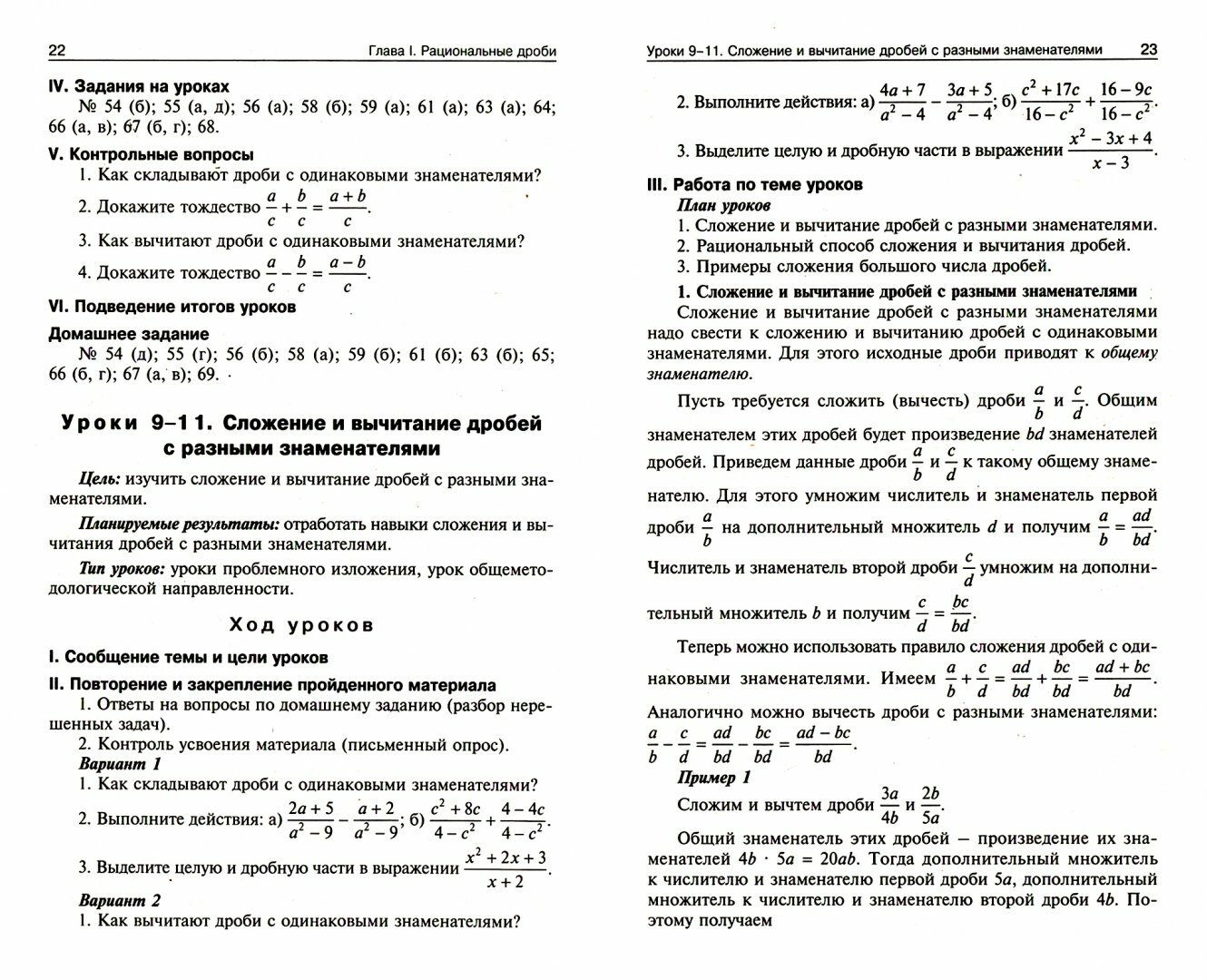 В пособии представлены подробные планы уроков алгебры в 8 классе общеобразовательных учреждений. Пособие предназначено в первую очередь для учителей, работающих по учебнику Ю.Н. Макарычева и др. (М.: Просвещение). Кроме того, в пособие также включены темы, позволяющие использовать его и при работе с учебником Ш.А. Алимова и др. (М.: Просвещение).
