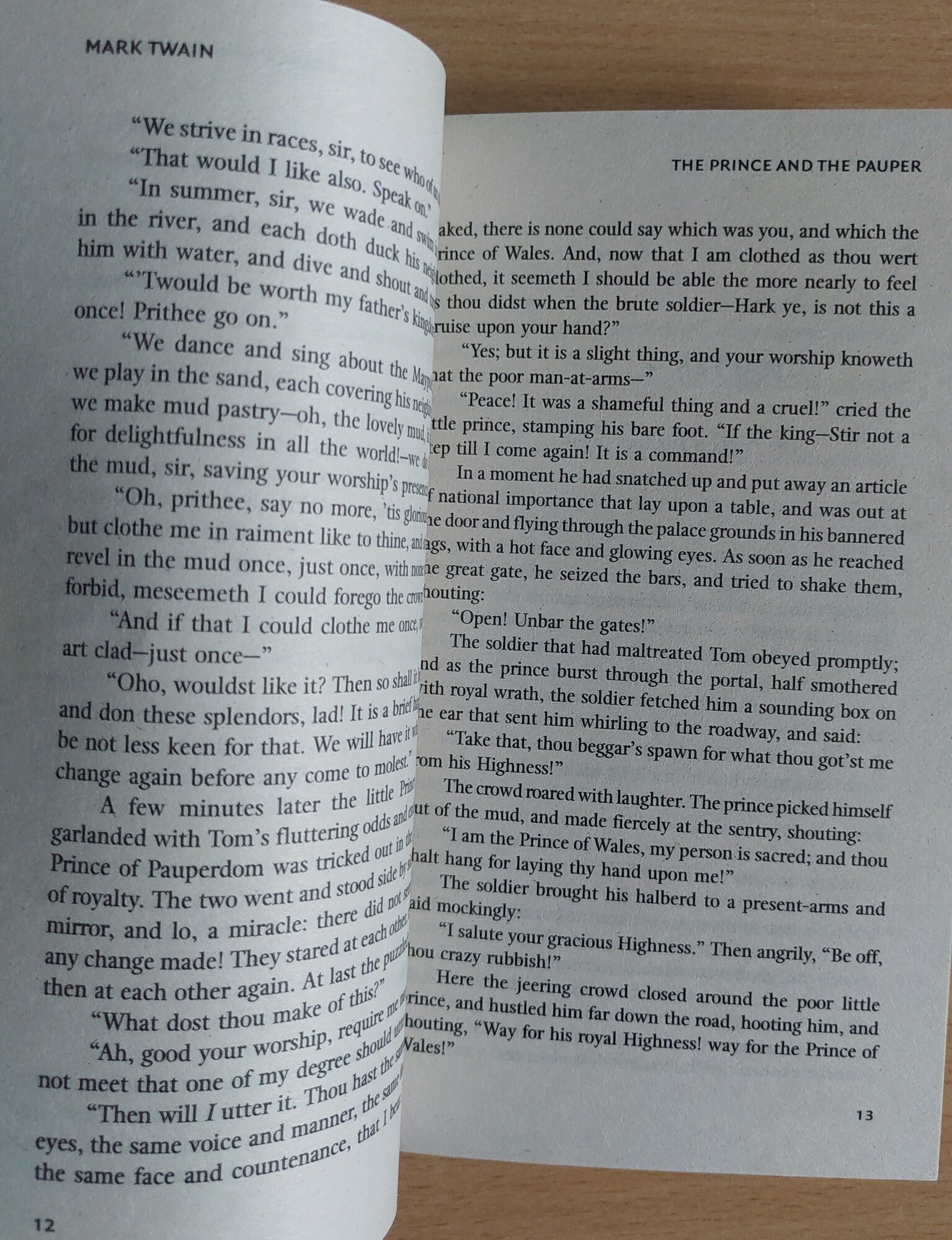 Коли купляла цю книжку, то думалося, що це має бути той Марк Твен, який у веселій манері прописав Тома Сойєра і Гекльберрі Фінна, але під час читання головні герої цього твору нагадали Айвенго Вальтера Скотта - теж правління монархів, які не які лицарі і багато обідранців, які не живуть, а існують. Так існують, бо з такими драконівськими законами можна тільки існувати. Але Марк Твен не був би Марком Твеном, якби головні герої - 2 хлопчаки - не перевернули все з ніг на голову. Один - з самих низів, інший - верхівка суспільства, принц. І неймовірна схожість між обома... Том Кенті, "принц з низів", випадково опиняється в той час у тому місці і тут все починається... Скажу лише, що хлопчина одразу ж прагне побороти надмірну жорстокість законів Англії. Тієї ж думки буде справжній престолонаслідник, який пройшовши і вогонь і воду, відчує майже все на своїй шкірі. Подиву і поваги варта і поведінка Тома у момент, коли все стає на свої місця: бідняк чесно вказує на справжнього короля, а не намагається укріпитись на престолі, що міг би зробити будь-який дорослий. Тож діти часом мудріші за дорослих.