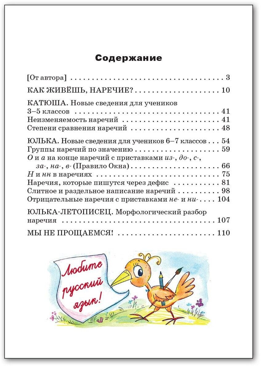 И эту книжку мы давно ждали. В сказочной форме и со стихами, со смешными запоминающимися картинками, хорошим русским языком в этой книге дается вся, необходимая школьнику, информация про эту часть речи. Об увлекательных путешествиях шестиклассницы, третьеклассницы и первоклассника будет интересно читать и ученику, только что познакомившемуся с понятием Наречие, и ученику 6-7 класса (каждому свою часть этой замечательной книжки).