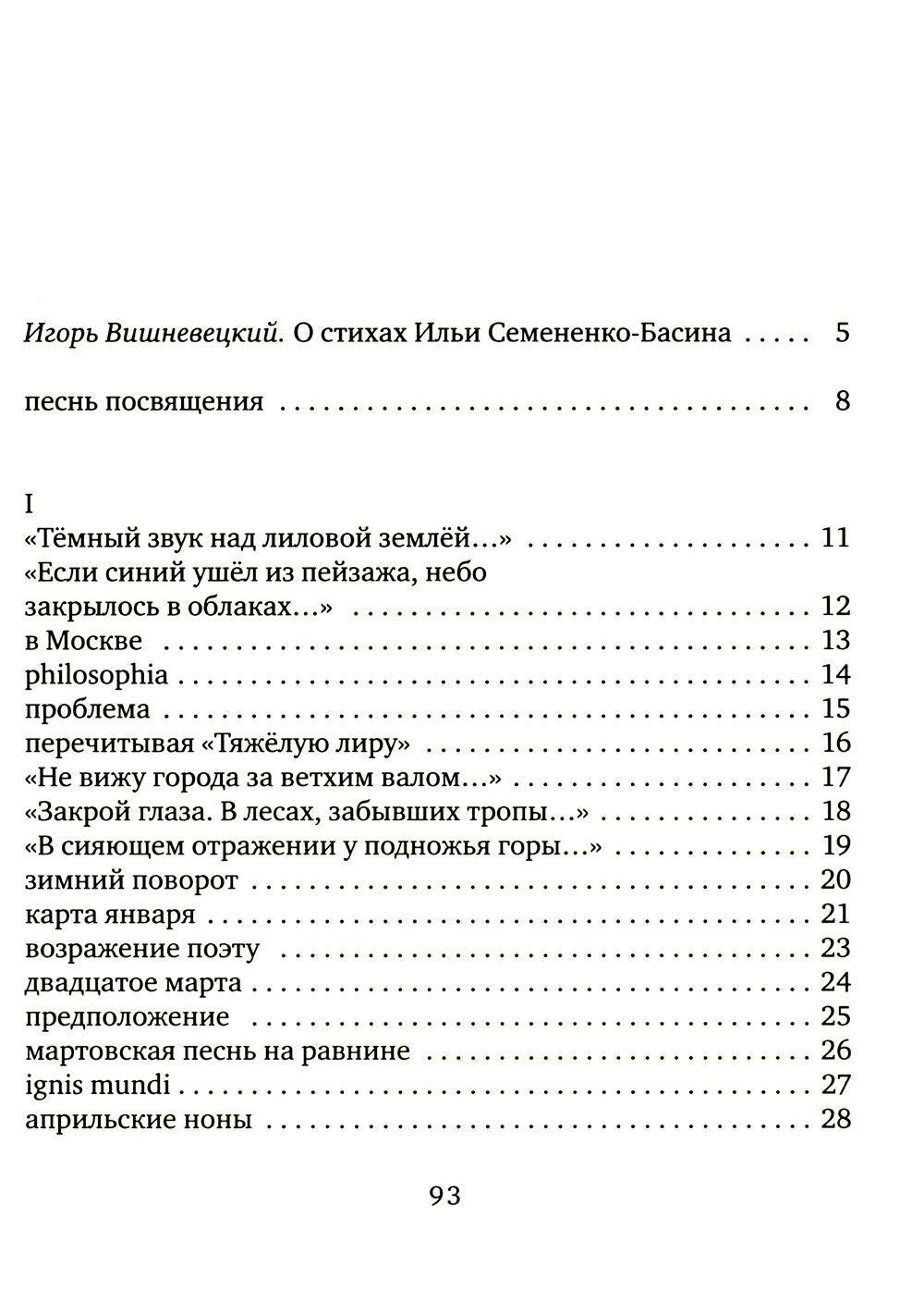 Первая книга И. Семененко-Басина, состоящая из стихотворений 2006—2011 гг., открывает сложившегося поэта. Наследник русской не официальной поэзии 1920—1960-х гг., Семененко-Басин сочетает поиск неисследованных ресурсов восприятия со способностью видеть мир символистично. Незримое присутствие тематики самосозидания личности заставляет вспомнить также традиции романтизма. Автор приглашает в путешествие по одушевленным ландшафтам личной истории, к соприкосновению с энергией природы и социальных движений, запечатленных в речи.