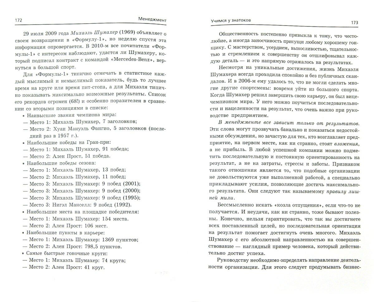 Франк Арнольд описывает знаменитые приемы менеджмента, опираясь на жизненный опыт почти 60 великих личностей. Он выбрал людей, добившихся успеха в самых разных сферах: политика, спорт, наука, искусство. Здесь представлен "звездный путь" Мадонны, Барака Обамы, Коко Шанель, Билла Гейтса, Стива Джобса, Майкла Джексона, Хиллари Клинтон и многих других. Основываясь на стратегии успеха этих людей, любой менеджер извлечет для себя ценный урок. Не каждый день мы можем чему-то научиться у настоящих мастеров своего дела. Главы состоят из урока от "знатока" и домашнего задания в виде перечня основных качеств или необходимых действий, которые должен совершить менеджер.