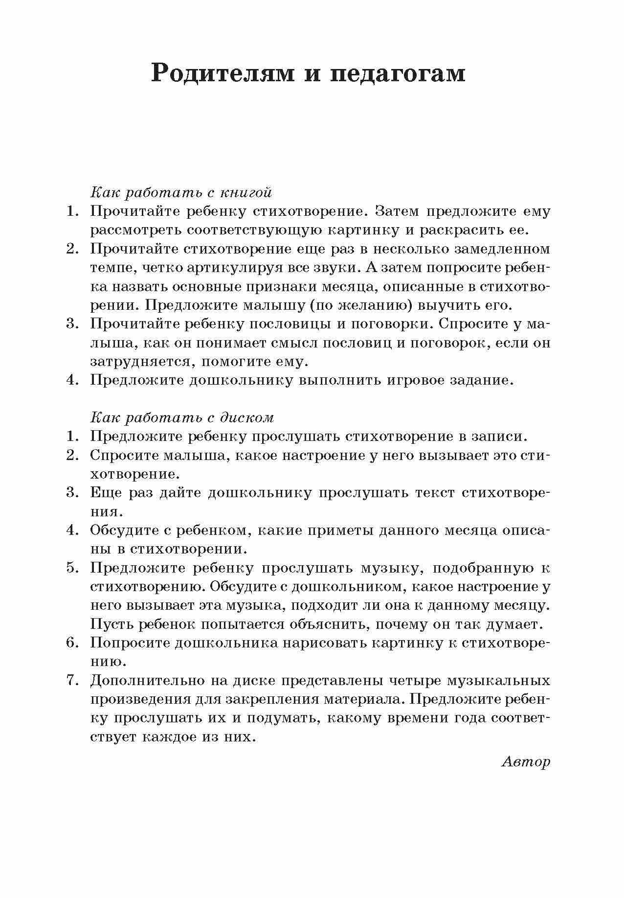Сборник включает в себя стихотворения, сказки, пословицы и поговорки, а также интересные игровые задания. Авторские стихи - описания знакомят детей с основными признаками каждого времени года и отдельно каждого конкретного месяца. Материал, изложенный в стихотворном виде, ребятам усвоить проще, так как дети очень чувствительны к ритму и рифме и получают особое удовольствие от стихов. При заучивании стихотворения ребенок закрепляет правильное произношение звуков и слов, пополняет свой словарный запас и развивает связную речь.