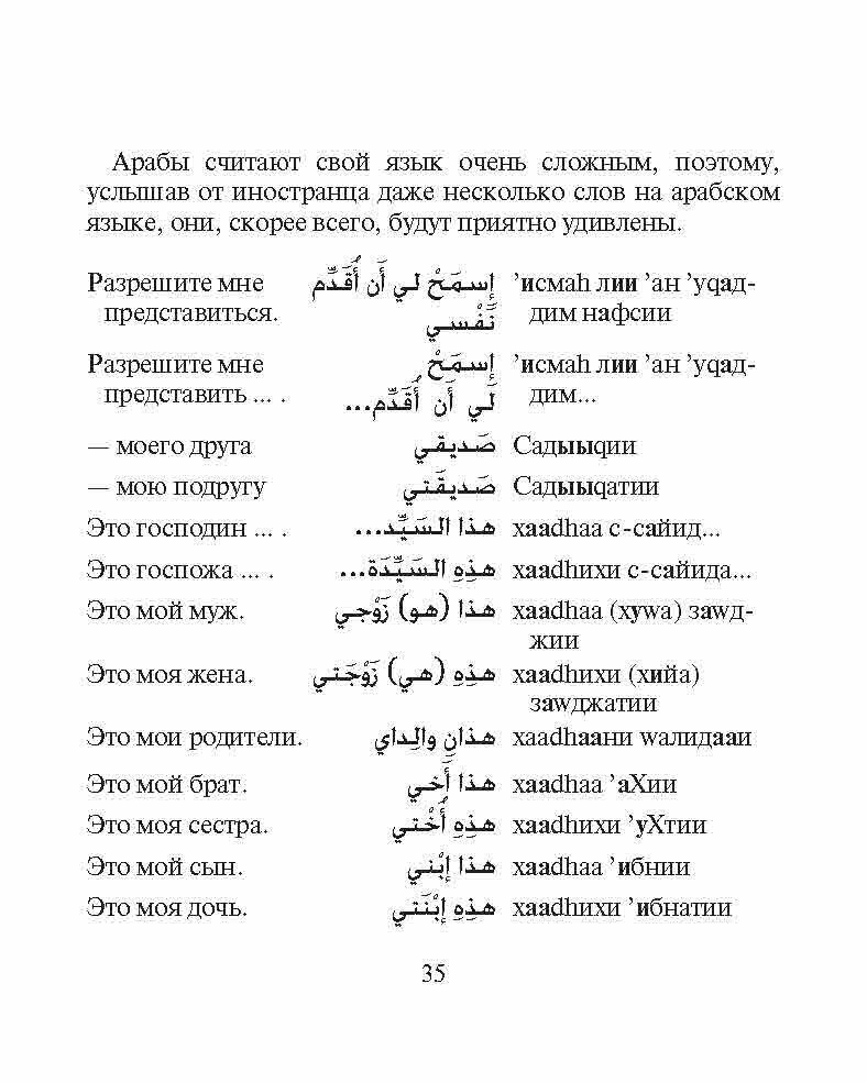 О это отличная книга. Не зная букв и не умея читать на арабском можно с легкостью заучить представленные фразы, и вот ты уже разговариваешь.Это прекрасно,я в восторге от этой книги,и удивила мужа(он учит арабский,а мне он не дается).Главное все легко и понятно написано,и доступно для понимания так,что даже дети прекрасно справятся. Один из лучших разговорников встречавшихся мне.