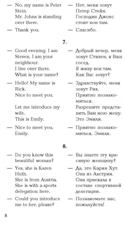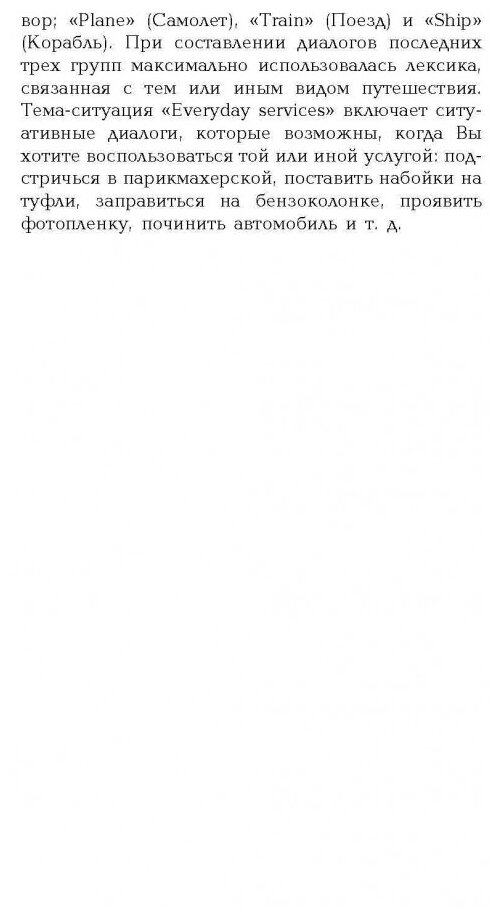 Рада, что мой выбор пал именно на эту книгу. Совснм небодьшая по объёму, но такая информативная. Это то, чего мне не хватало в постижении тонкостей английского языка. Современный, не официальный, а бытовой разговорный язык! Очень широкий охват жизненных ситуаций, и пл каждой живые диалоги, незатёртые фразы. Я сделала правильный выбор! Рекомендую всем, кто ещё ищет себе друга поговорить- вот он!