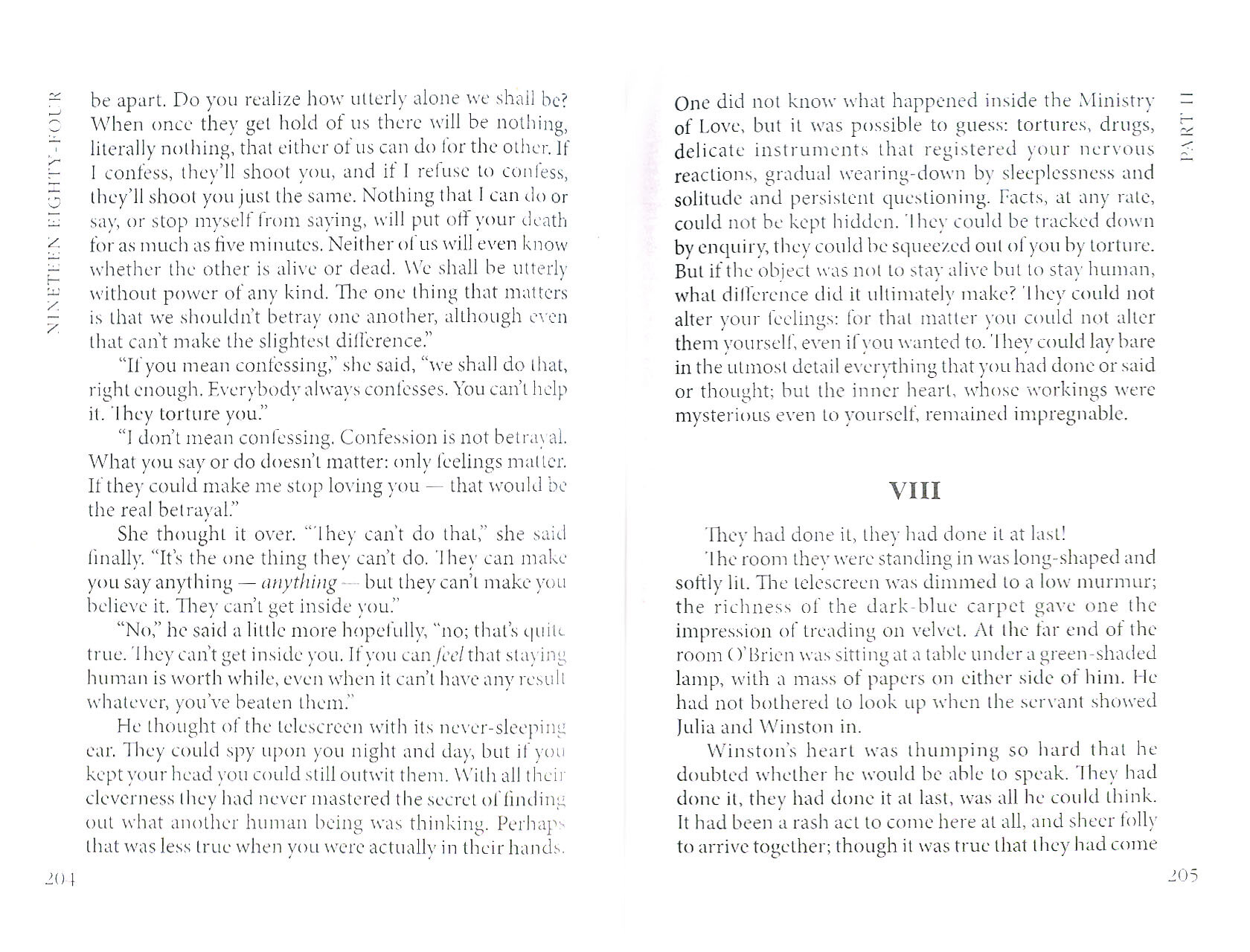 “He wrote first in large clumsy capitals: FREEDOM IS SLAVERY. Then almost without a pause he wrote beneath it: TWO AND TWO MAKE FIVE.” (c)