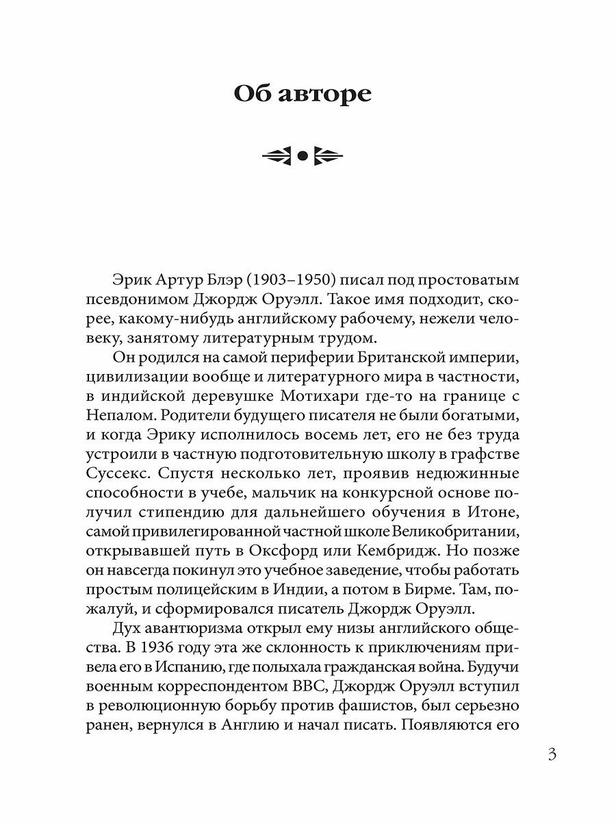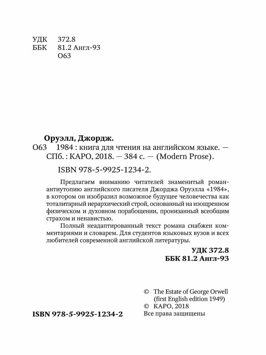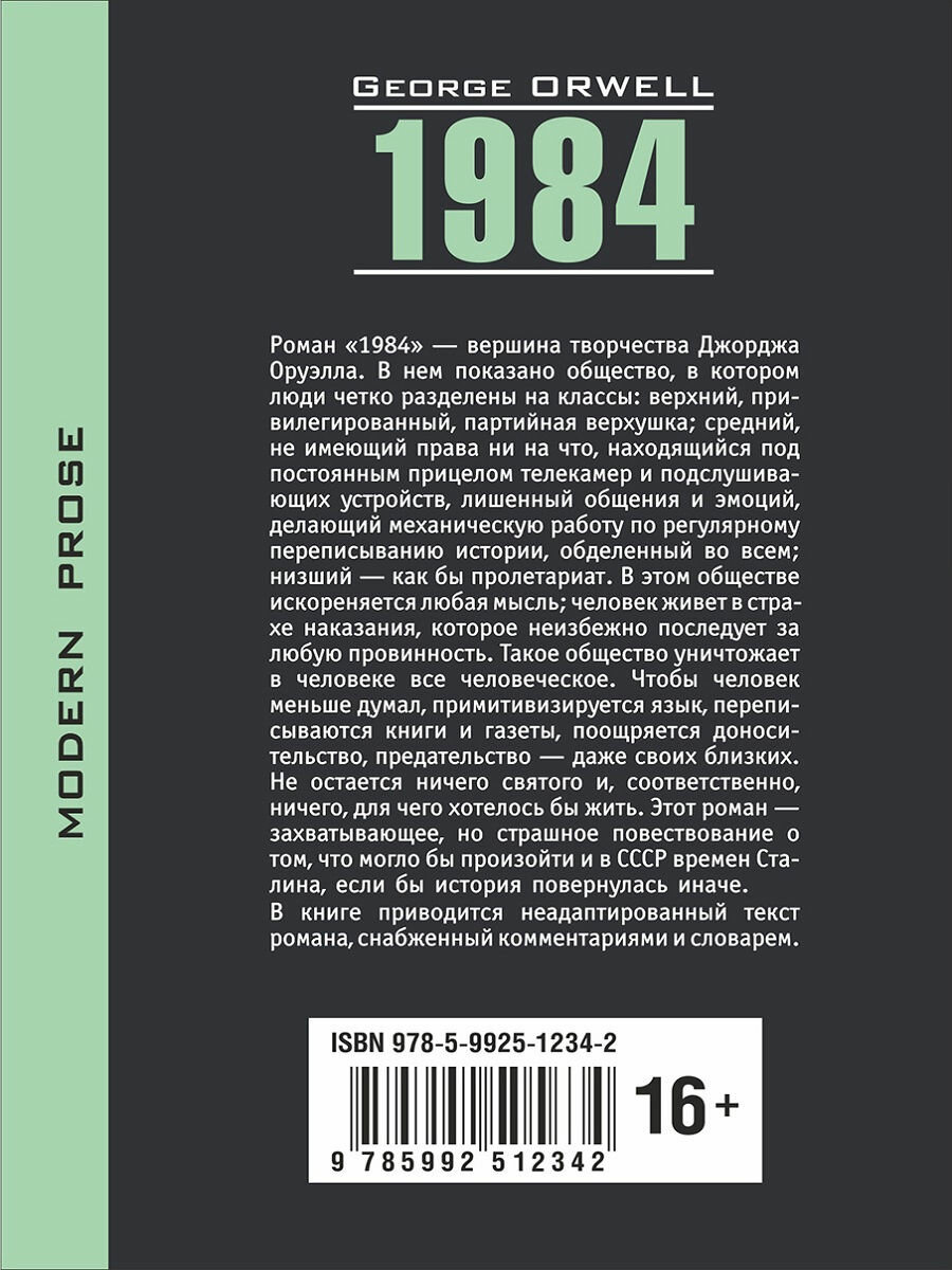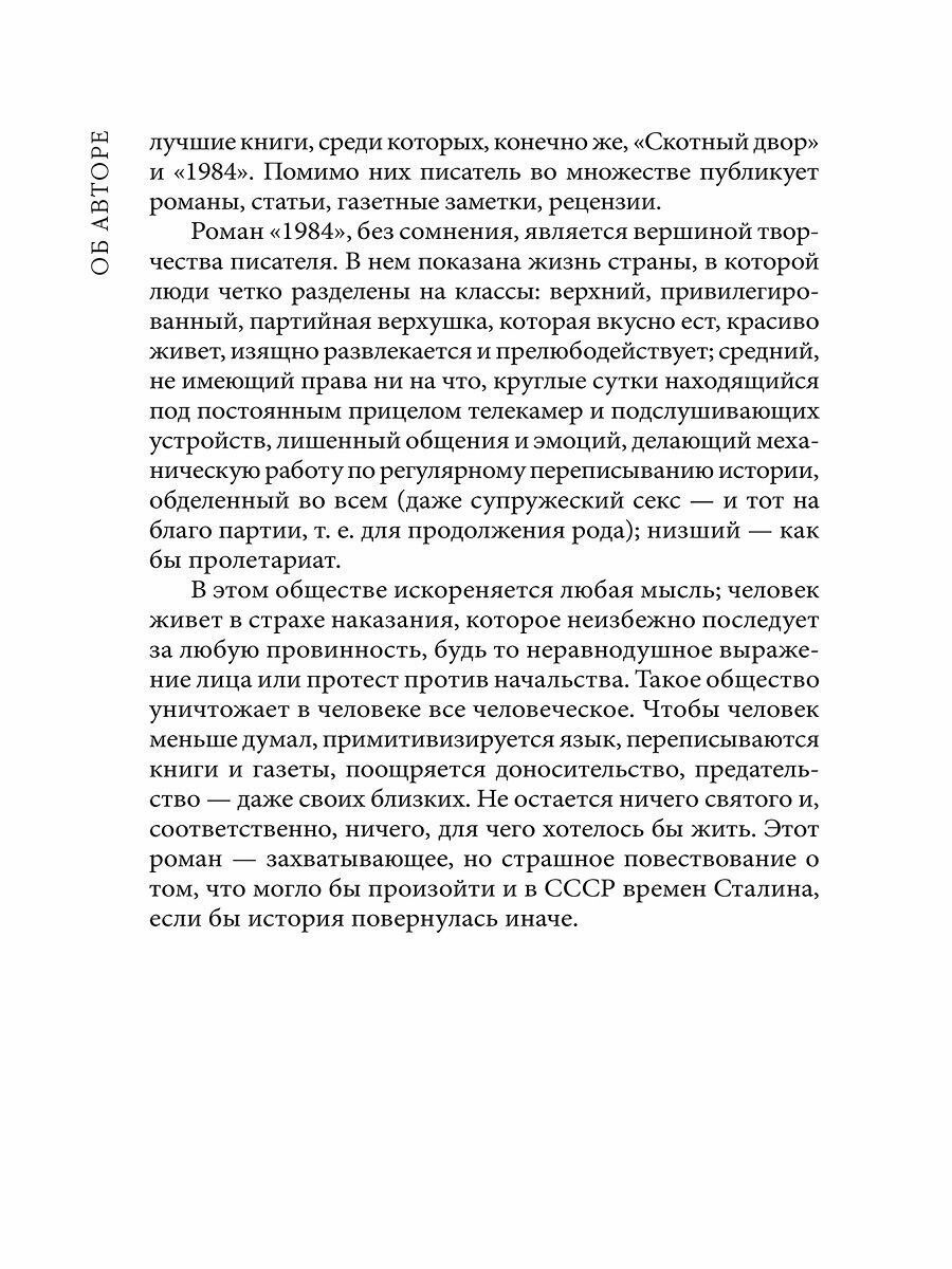 Роман "1984" - вершина творчества Джорджа Оруэлла. В нем показано общество, в котором люди четко разделены на классы: верхний, привилегированный, партийная верхушка; средний, не имеющий права ни на что, находящийся под постоянным прицелом телекамер и подслушивающих устройств, лишенный общения и эмоций, делающий механическую работу по регулярному переписыванию истории, обделенный во всем; низший - как бы пролетариат. В этом обществе искореняется любая мысль; человек живет в страхе наказания, которое неизбежно последует за любую провинность. Такое общество уничтожает в человеке все человеческое. Чтобы человек меньше думал, примитивизируется язык, переписываются книги и газеты, поощряется доносительство, предательство - даже своих близких. Не остается ничего святого и, соответственно, ничего, для чего хотелось бы жить. Этот роман - захватывающее, но страшное повествование о том, что могло бы произойти и в СССР времен Сталина, если бы история повернулась иначе. В книге приводится неадаптированный текст романа, снабженный комментариями и словарем.