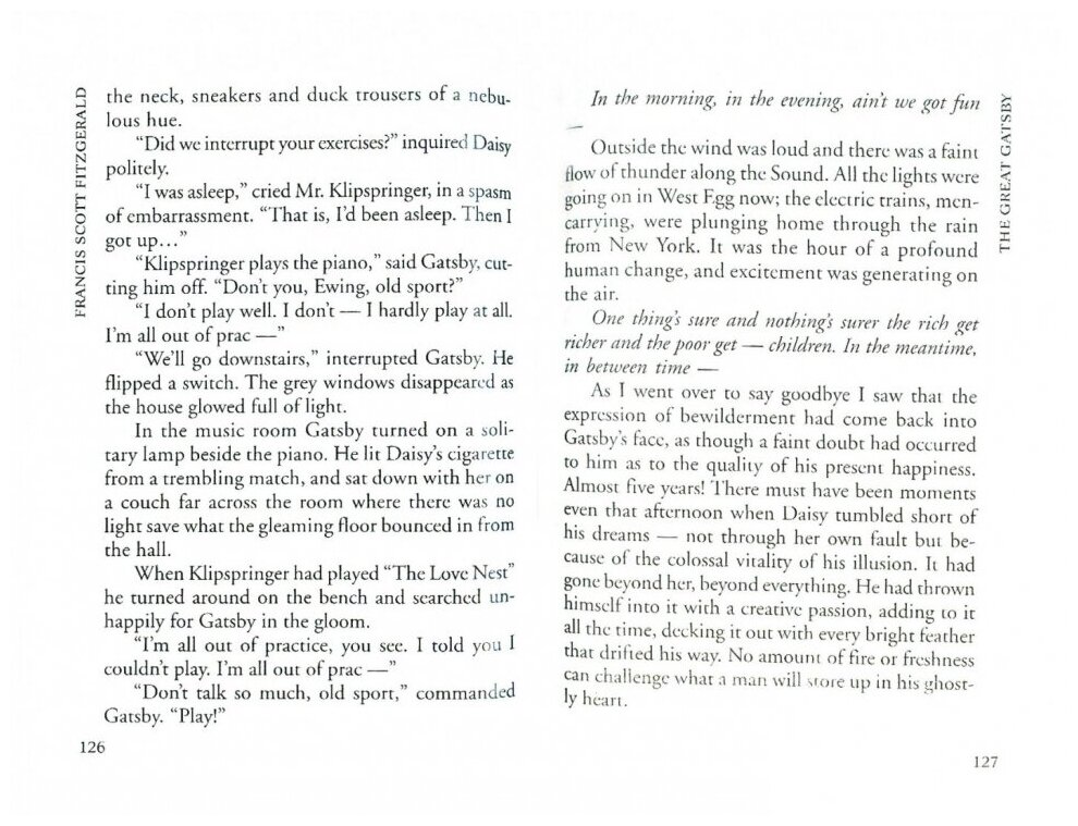 Эта книга заставила меня лишний раз убедиться в том, что Фрэнсис Скотт Фицджеральд один из лучших американских писателей своего времени. Данную книгу очень удобно носить с собой, потому что она очень легкая и маленькая. Текст написан красивым классическим английским и понятным языком. В изучении иностранного языка очень важно читать материал на неродном для тебя языке, поэтому я призываю не бояться начинать читать книги на иностранных языках и можно начать, например, с "Великого Гэтсби".