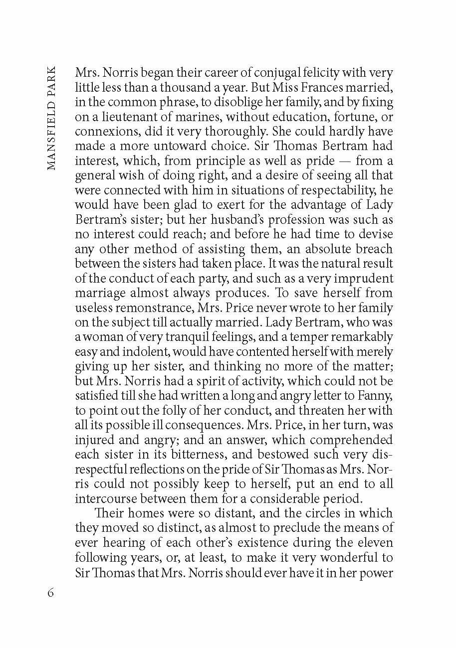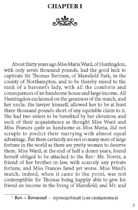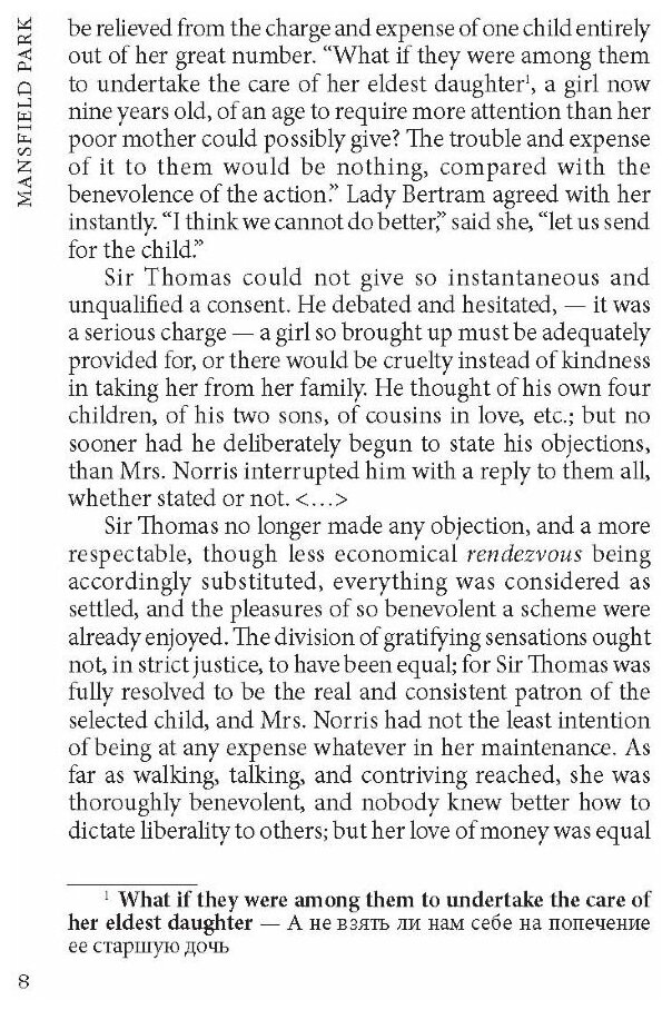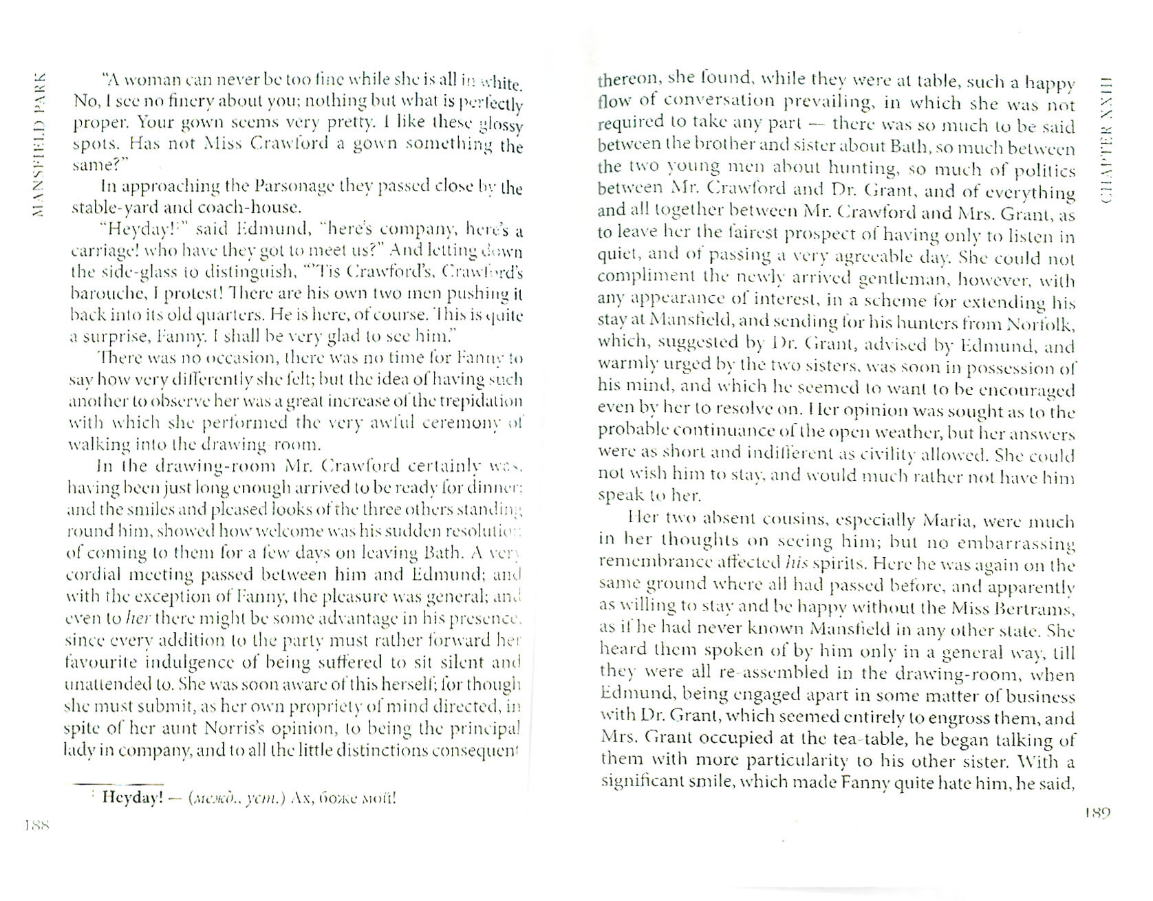 Спойлер возможен."Мэнсфилд-парк" всё же уступает" Гордости и предубеждению" и "Эмме", но читать этот роман всё же очень интересно. Как мне кажется, главной героине не достаёт живости и яркости характера.Как и во всех романах Джейн Остен, здесь много английского юмора , лёгкости, иронии и любви. С ее книгами можно отдыхать. А в оригинале их читать вообще наслаждение! Сюжет о юной девушке и ее любовном приключении. Как и во всех остальных книгах Остен, всё заканчивается хорошо)В этом и прелесть ее книг, это заряд хорошего настроения и мечтательности. Издание прекрасное, текст неадаптирован-это безусловно плюс, обложка симпатичная, мягкая, а бумага достаточно плотная.