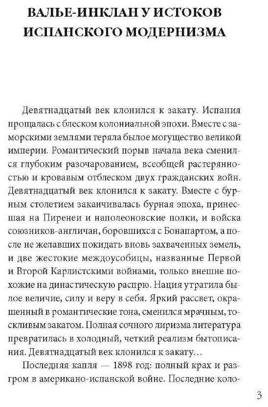 Предлагаем вниманию читателей книгу одного из крупнейших испанских писателей конца XIX - первой трети ХХ века Рамона дель Валье-Инклана (1866-1936). В книге приводится неадаптированный текст новелл, снабженный комментариями и словарем. Рамон Мария дель Валье-Инклан-и-де-ла-Пенья (1866-1936) принадлежит к так называемому "поколению катастрофы", т. е. к группе писателей, расцвет литературной деятельности которых относится к эпохе, непосредственно следовавшей за испано-американской войной 1898-1899 годов. Начав с анархизма, Валье-Инклан с течением времени сделался защитником идей "церкви, родины и короля". Он выражает настроения той части испанской интеллигенции - главным образом, клерикально настроенных городских кругов - которая видит спасение Испании в возвращении к "чистым" традициям испанского средневековья и Возрождения. Любимым героем писателя является маркиз де Брадомин, главное действующее лицо его "Сонат" - современный Дон-Жуан, некрасивый, католически настроенный и сентиментальный. В этой романтической фигуре Валье-Инклан хотел воскресить традиционный тип "испанского идальго". Предлагаем вниманию читателей книгу одного из крупнейших испанских писателей конца XIX - первой трети ХХ века Рамона дель Валье-Инклана (1866-1936). В книге приводится неадаптированный текст новелл, снабженный комментариями и словарем.