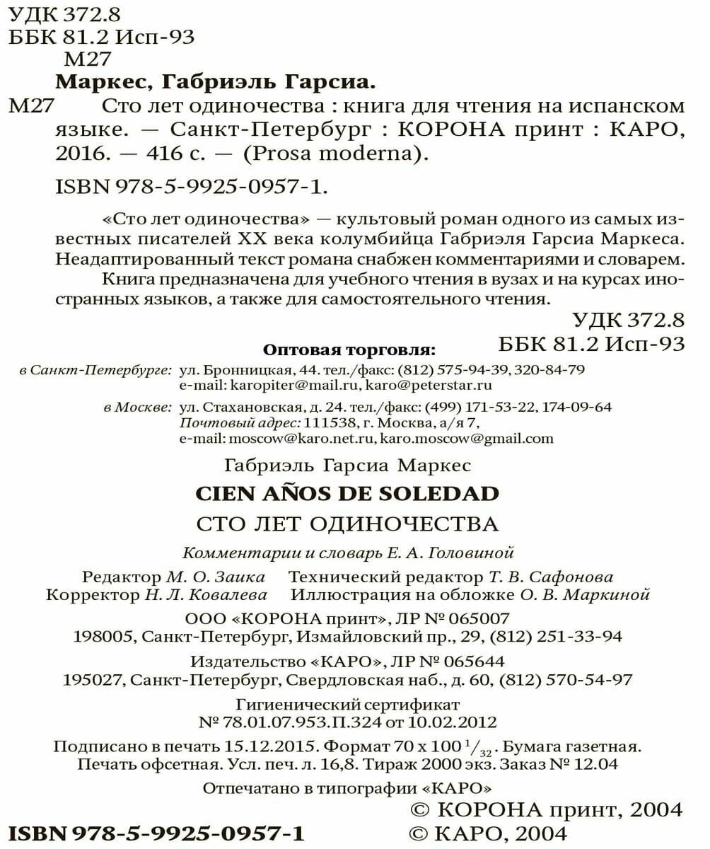 На сегодняшний день товар «Книга: Cien anos de soledad. Сто лет одиночества: Книга для чтения на исп.яз. (Marquez Gabriel Garcia); КАРО, 2018» можно купить с кешбеком в 2 магазинах: book24, Яндекс.Маркет