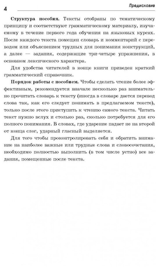5. Книга построена таким образом, что сначала дан текст (тексты усложняются по мере того как Вы продвигаетесь вперёд по книге), затем словарик и упражнения к тексту.