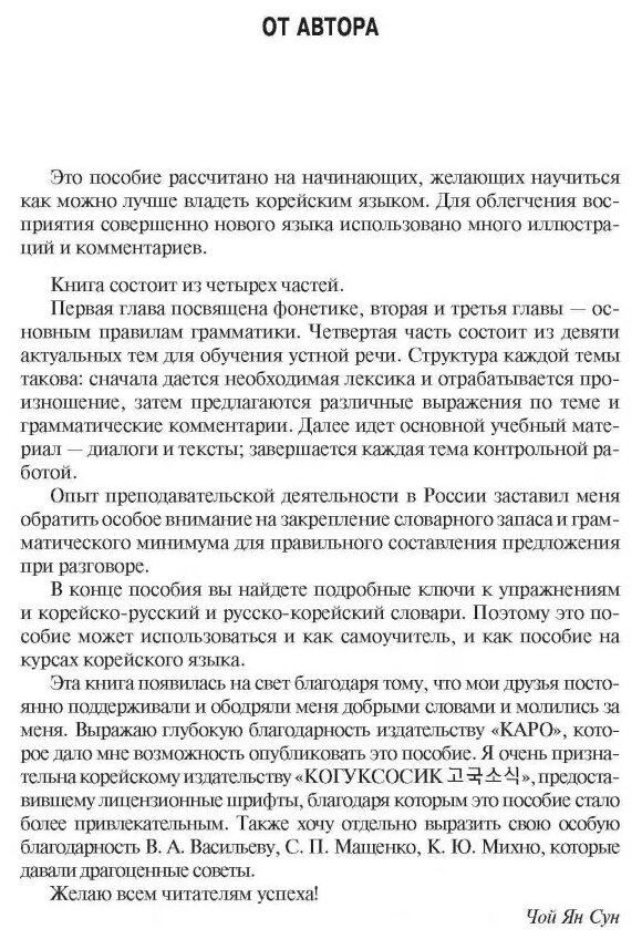 Данный учебник вполне может сойти и за самоучитель, для тех кто планирует изучать корейский самостоятельно, так как знакомство с языком начинается действительно с самых азов - с алфавита, и весь материал изложен достаточно доступным языком, не перегруженным терминами. Огромный плюс в том, что книга содержит задания для самопроверки: письменные упражнения, кроссворды и даже диктанты (для этого вам понадобится CD, который нужно заказывать отдельно).