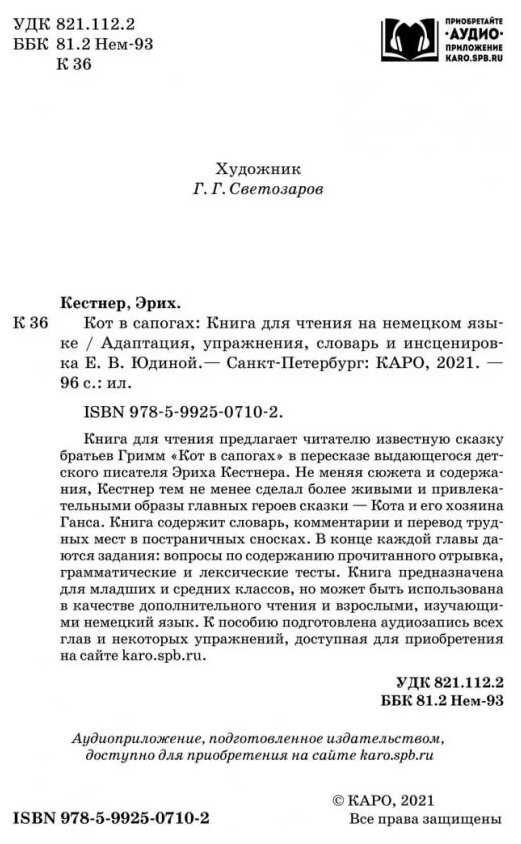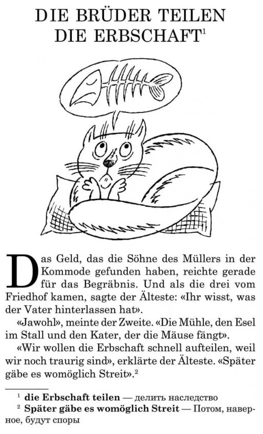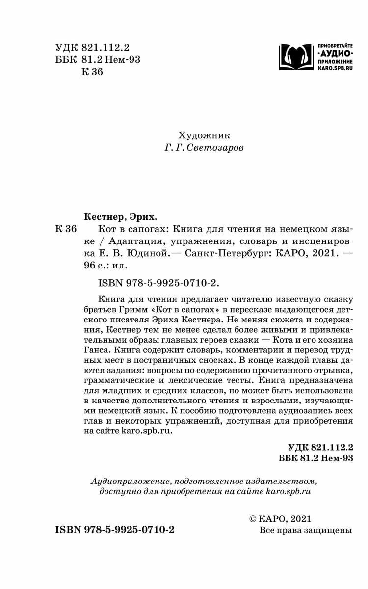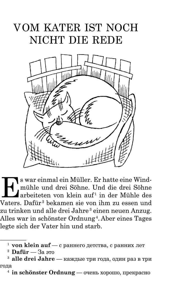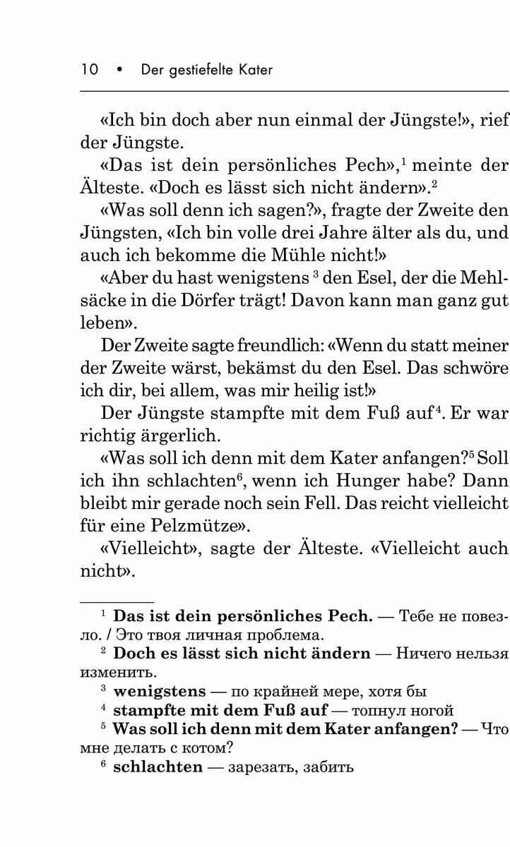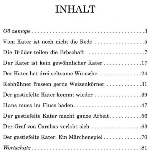 Книга для чтения предлагает читателю известную сказку братьев Гримм «Кот в сапогах» в пересказе выдающегося детского писателя Эриха Кестнера. Не меняя сюжета и содержания, Кестнер тем не менее сделал более живыми и привлекательными образы главных героев сказки — Кота и его хозяина Ганса. Книга содержит словарь, комментарии и перевод трудных мест в постраничных сносках. Все главы и некоторые упражнения записаны на компакт-диск в формате МР3. В конце каждой главы даются задания: вопросы по содержанию прочитанного отрывка, грамматические и лексические тесты. Книга предназначена для младших и средних классов, но может быть использована в качестве дополнительного чтения и взрослыми, изучающими немецкий язык.