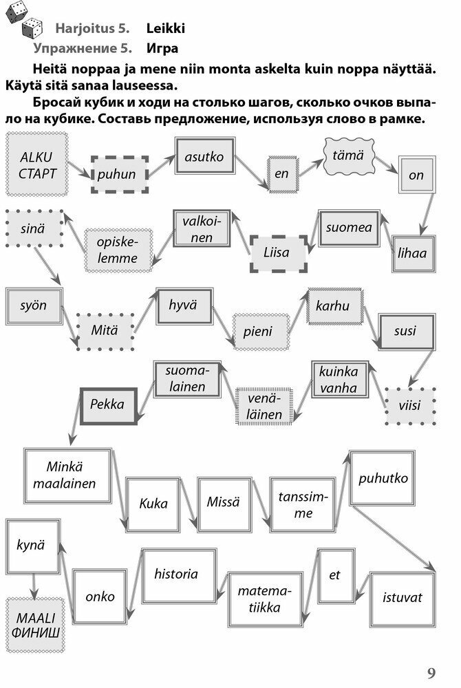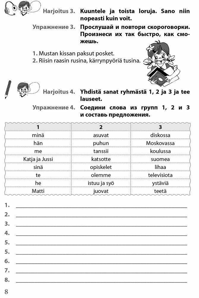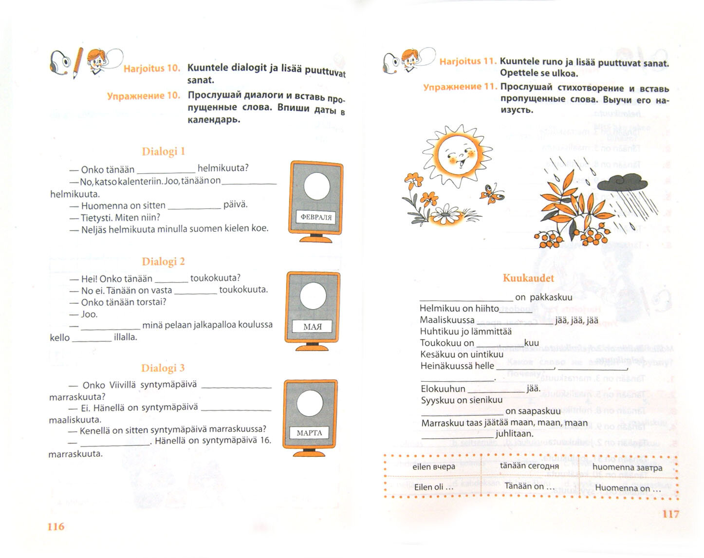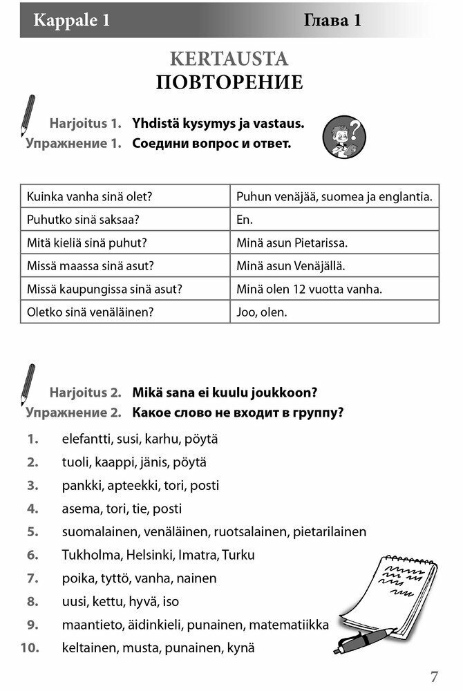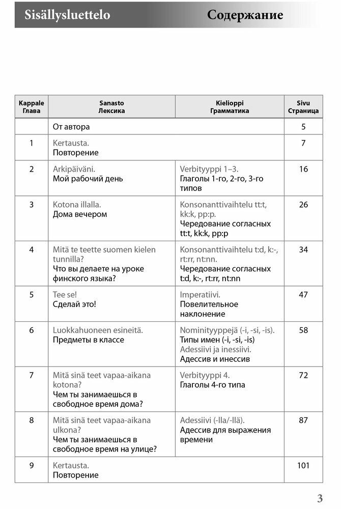 Купила домой, так как в школе ребёнок учит финский по этим учебникам. Но скорее это не учебник, а сборник заданий. Грамматика дана минимально, без пояснений, а вот упражнений много. Упражнения оформлены так, что выполнять их надо в самом учебнике. Это как- то не совсем удобно. Особенно учитывая то, что у нас они используются в школе на уроках с разными классами . Можно, конечно, копировать , но мы решили , что проще купить свой.