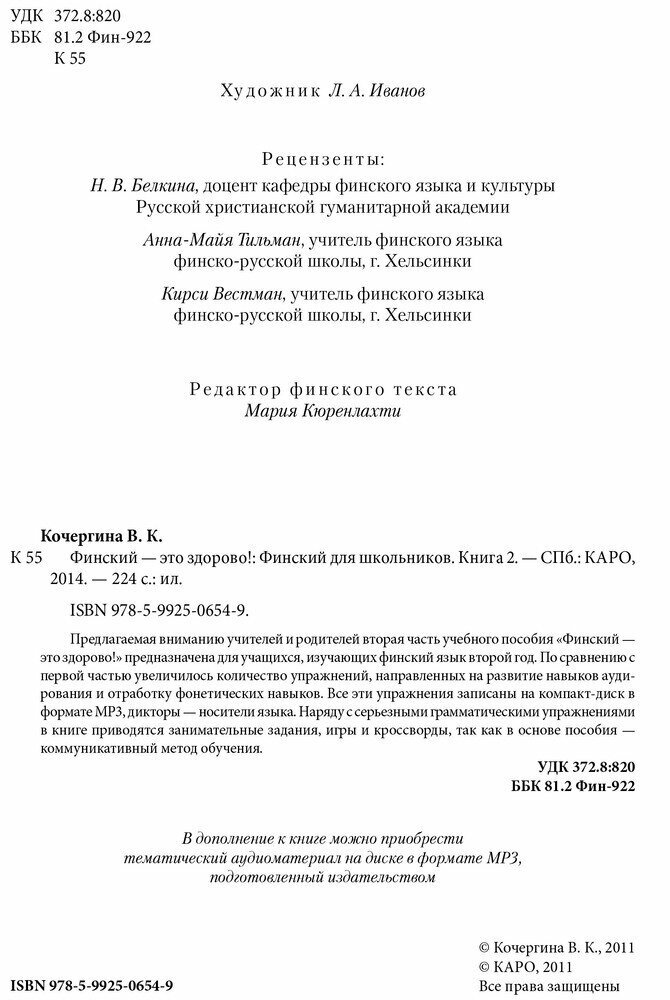Книга, предлагаемая вниманию учителей финского языка и родителей, чьи дети изучают финский язык, является второй частью учебного пособия "Hauskasti suomea!". В основе этого пособия лежит коммуникативный метод обучения, поэтому в содержательном плане пособие напоминает первую часть: в нем также много рисунков, наглядного материала, коммуникативных заданий, игр и кроссвордов - всего того, что помогает детям увлечься иностранным языком, сделать уроки интересными и веселыми. Увеличилось количество заданий, направленных на развитие навыков аудирования и отработку фонетических навыков (в среднем в каждой главе теперь 7-10 заданий такого типа). Скороговорки, которые приводятся практически в каждой главе, способствуют развитию беглости речи, а выполнение заданий "Послушай аудиозапись. Что ты услышал?" совершенствует восприятие иноязычной речи на слух. Всем известно, что невозможно говорить на иностранном языке, ни разу не услышав его носителя, поэтому все тексты, стихи и упражнения начитаны только носителями финского языка.