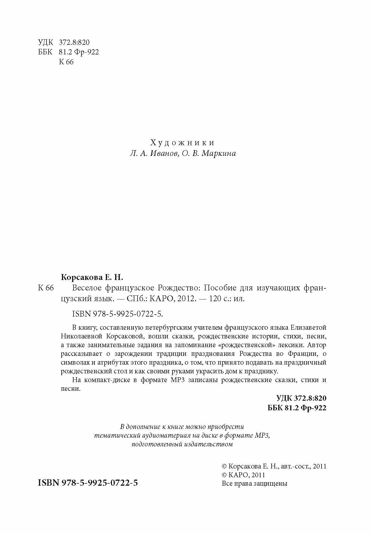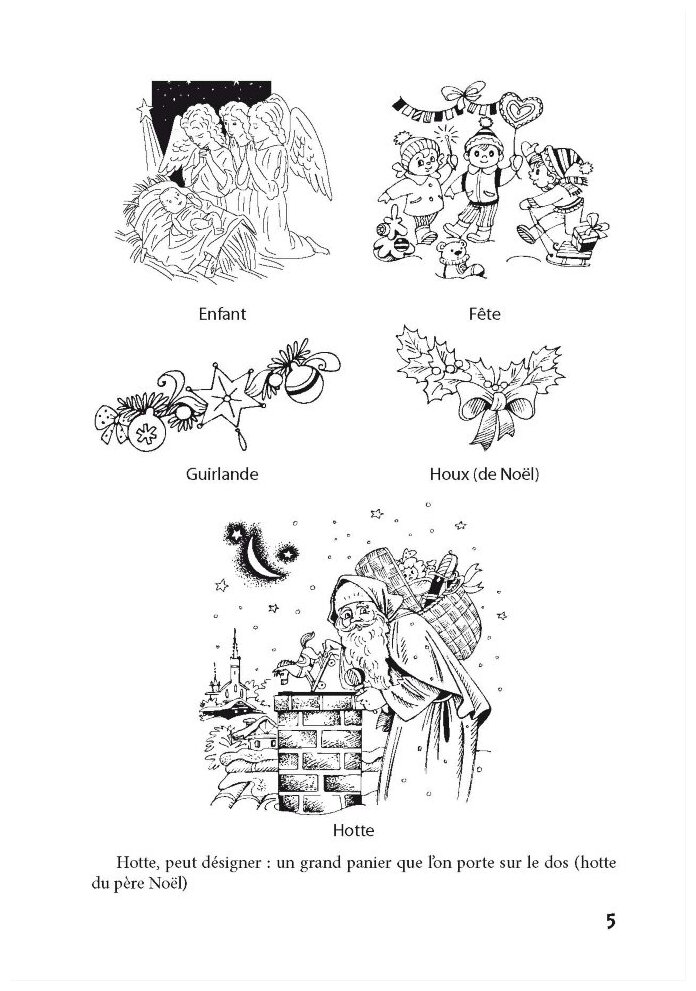 В книгу, составленную петербургским учителем французского языка Елизаветой Николаевной Корсаковой, вошли сказки, рождественские истории, стихи, песни, а также занимательные задания на запоминание "рождественской" лексики. Автор рассказывает о зарождении традиции празднования Рождества во Франции, о символах и атрибутах этого праздника, о том, что принято подавать на праздничный рождественский стол и как своими руками украсить дом к празднику.