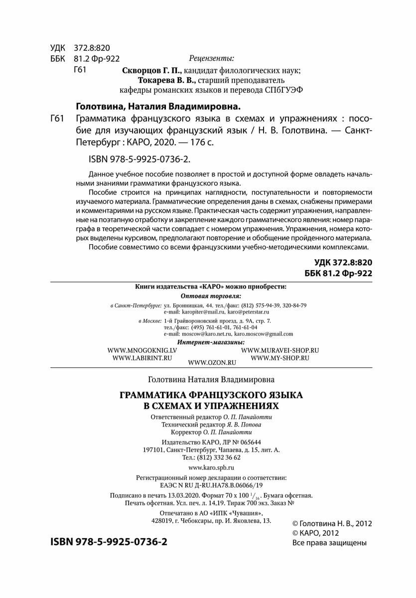 Французский язык Грамматика в схемах и упражнениях (Наталия Владимировна Голотвина); КАРО, 2020
