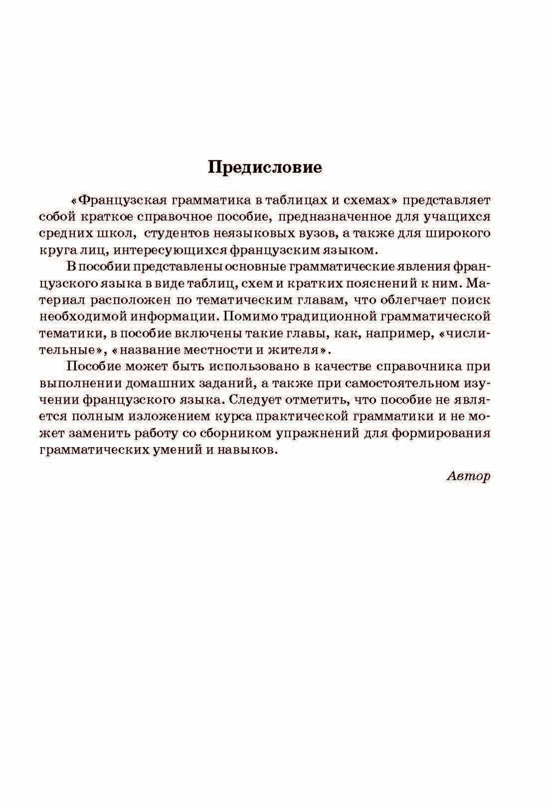Данное пособие представляет собой сокращенный вариант справочника по грамматике .Книгу можно рассматривать , как вспомогательный материал при выполнении грамматических заданий по французскому языку для средней школы.Материал представлен с примерами по темам,с переводом,в таблицах и схемах,с правилами.Показаны примеры словообразования,описано образование времен,глаголы-исключения для запоминания.Достаточно грамматики для разбора предложений на франц.языке по временам.Показаны ,как некоторые части речи меняют форму.В целом книга понятна,достаточно удобна в обращении.Небольшого формата ,поэтому этот справочник можно всегда иметь при себе.