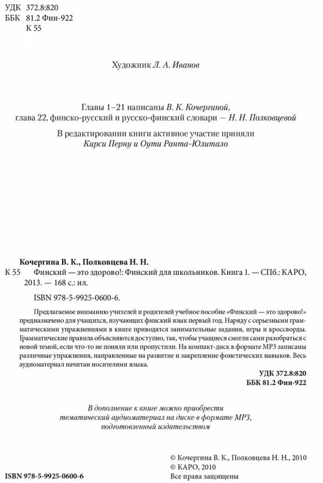 Предлагаемое вниманию учителей и родителей учебное пособие "Финский - это здорово!" предназначено для учащихся, изучающих финский язык первый год. Наряду с серьезными грамматическими упражнениями в книге приводятся занимательные задания, игры и кроссворды. Грамматические правила объясняются доступно, так, чтобы учащиеся смогли сами разобраться с новой темой, если что-то не поняли или пропустили. На компакт-диск в формате MP3 записаны различные упражнения, направленные на развитие и закрепление фонетических навыков. Весь аудиоматериал начитан носителями языка.