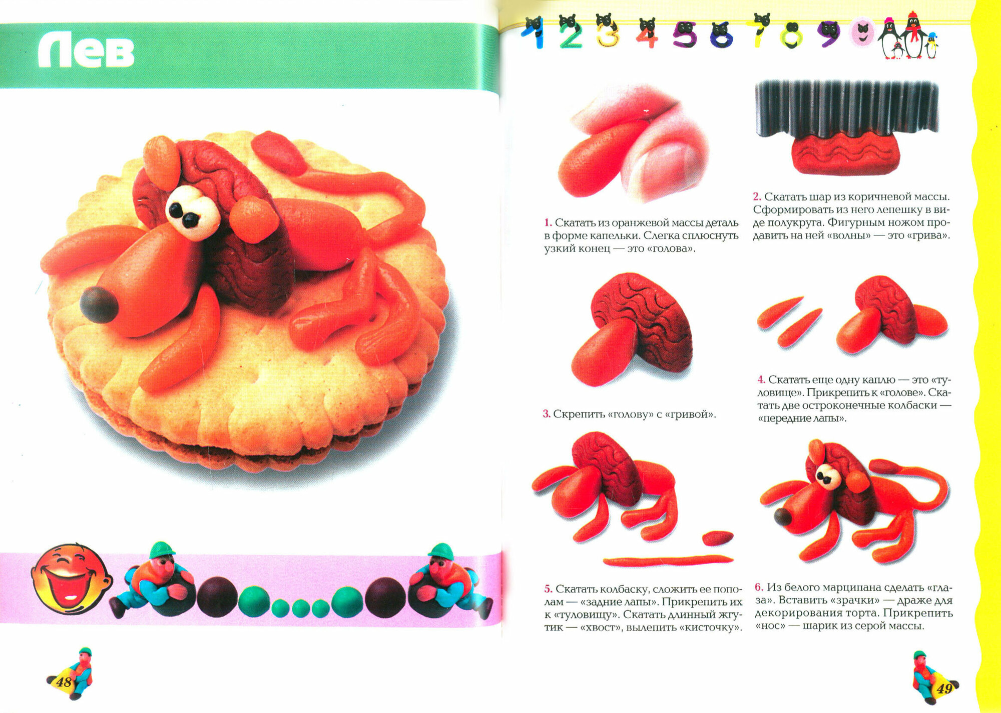 Книга очень яркая и мягкая, можно как угодно сворачивать, не боясь повредить, обложка и бумага гладкая. В принципе, если вы лепите с ребенком из пластилина, то наверное можно и не заморачиваться по этому поводу. НО я её покупала в надежде на рецепты тех самых сладких масс! И они оправдались, в начале показаны и описаны все нужные инструменты, потом рецепты ну собственно сама лепка, пошаговая. А главное! Порадовала идея украшения именно печенья и пирожных, т.к. лично я не рискнула бы дать своим деткам украшать торт на какое-нибудь торжество. А представленные фигурки ну ооочень простые, справится даже ребенок.